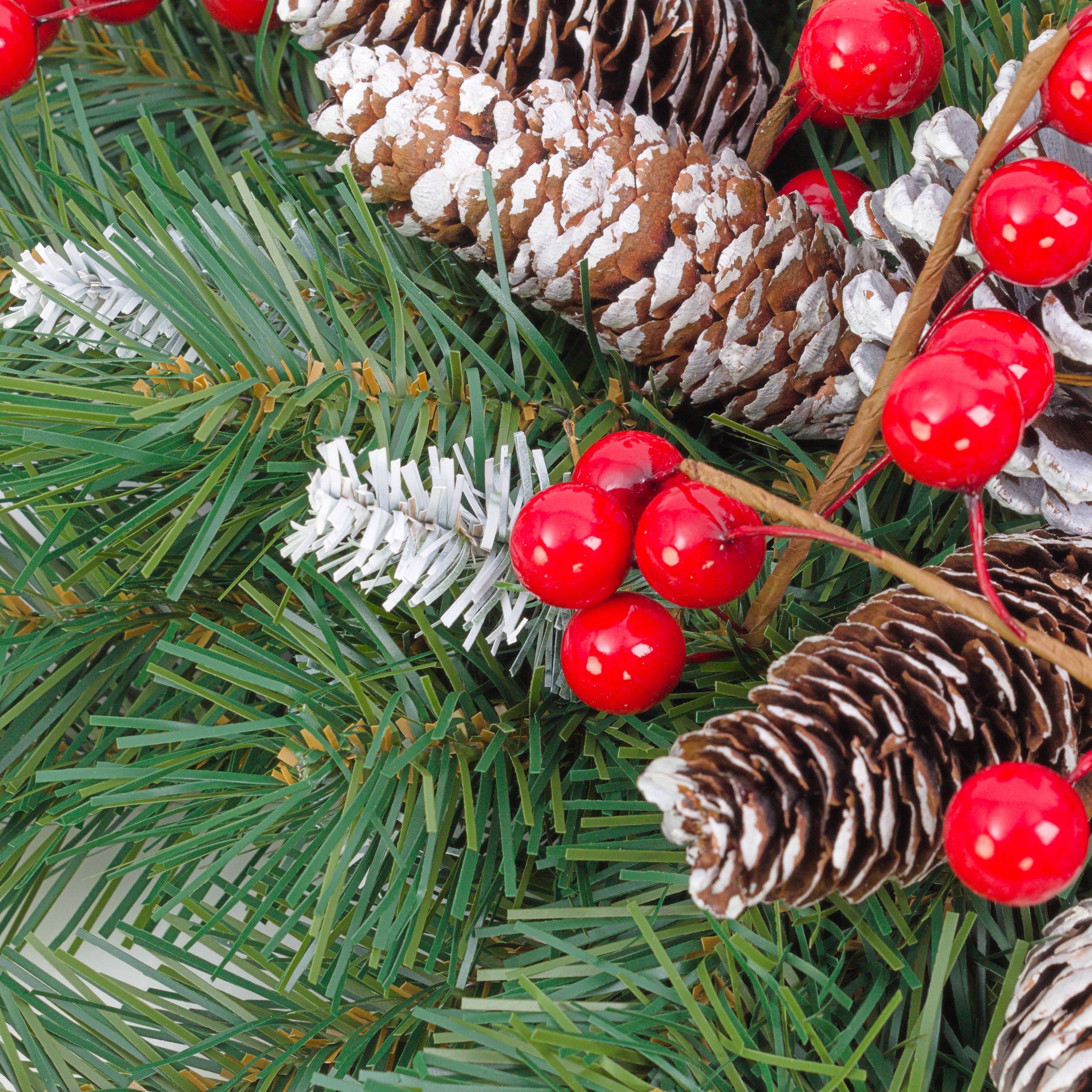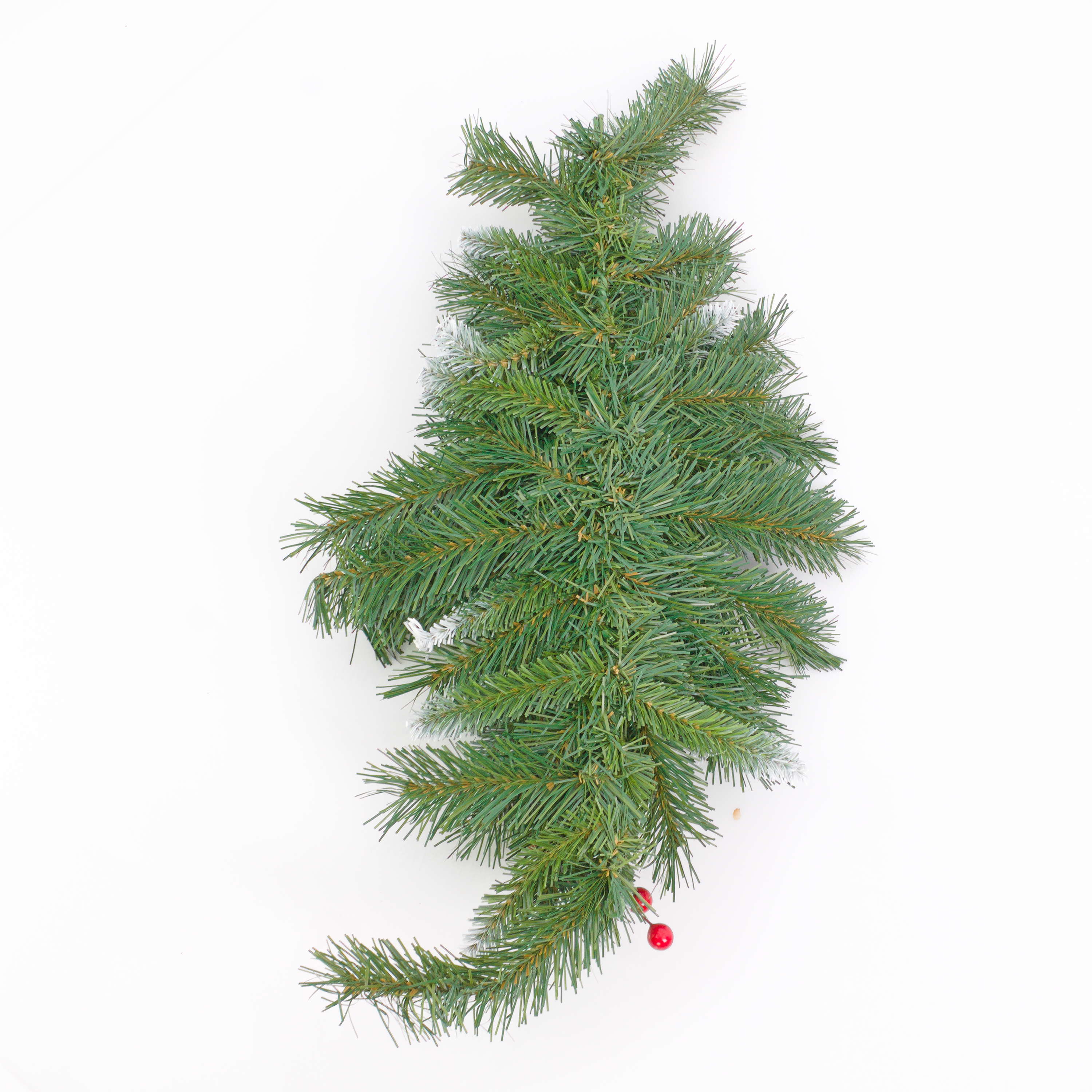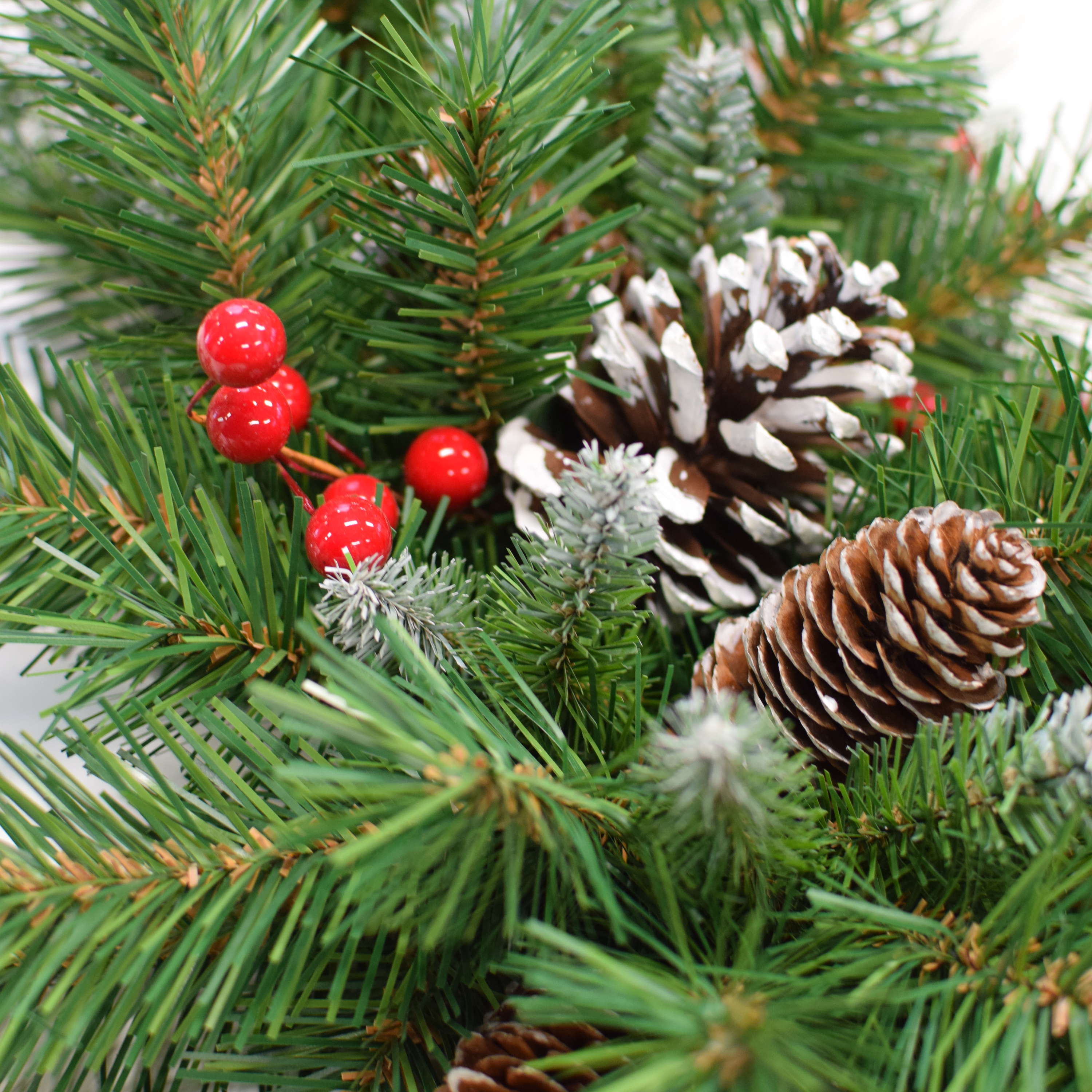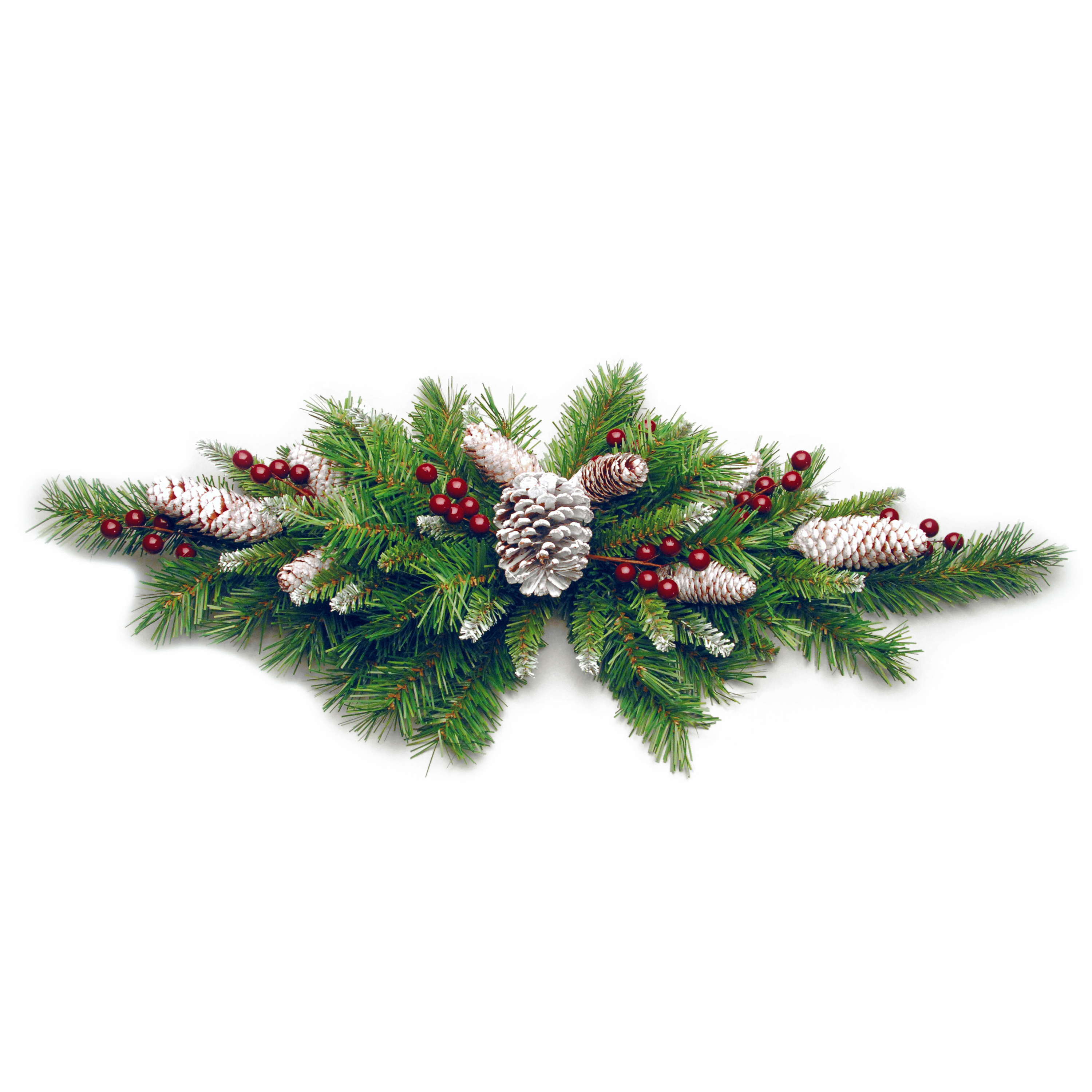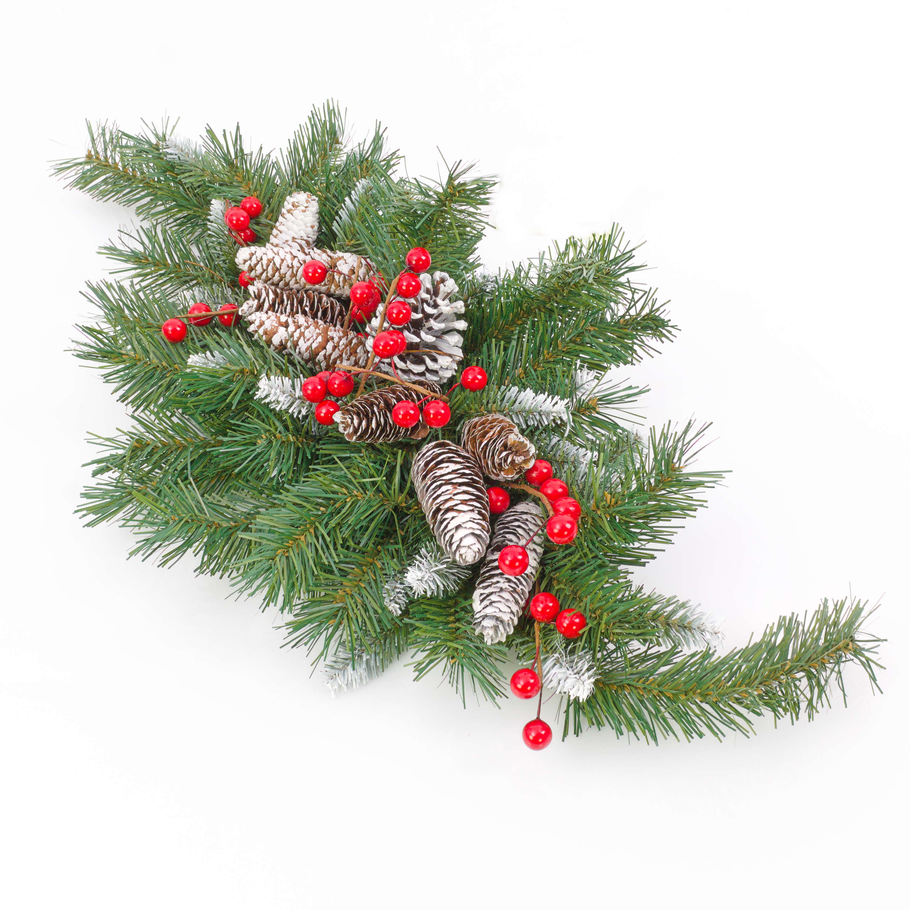 - Costruzione folta con aghi di colore verde scuro, parzialmente innevati e in fibra tessile di ottima qualitá; si aggiungono alla composizione le bacche di colore rosso e le pigne innevate.