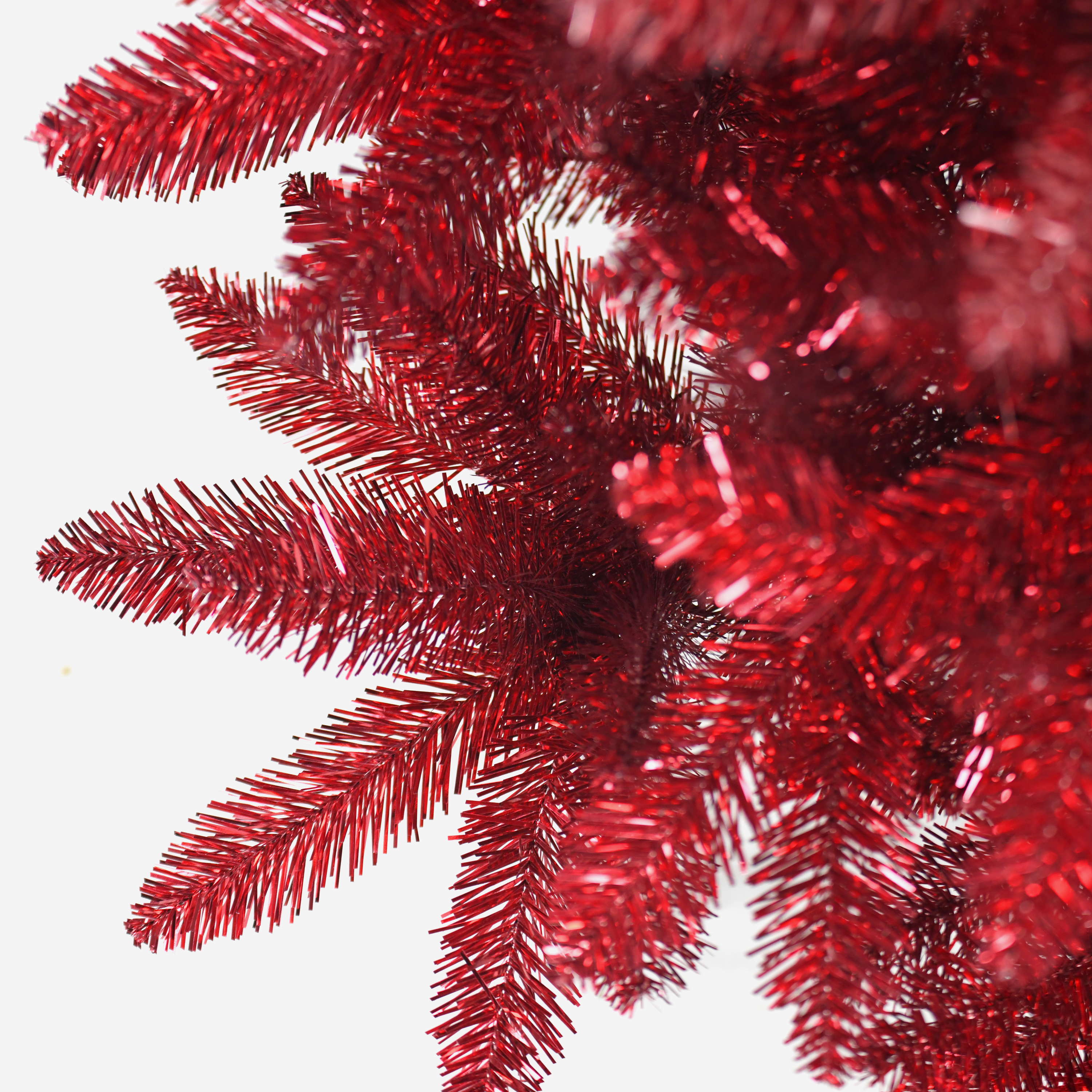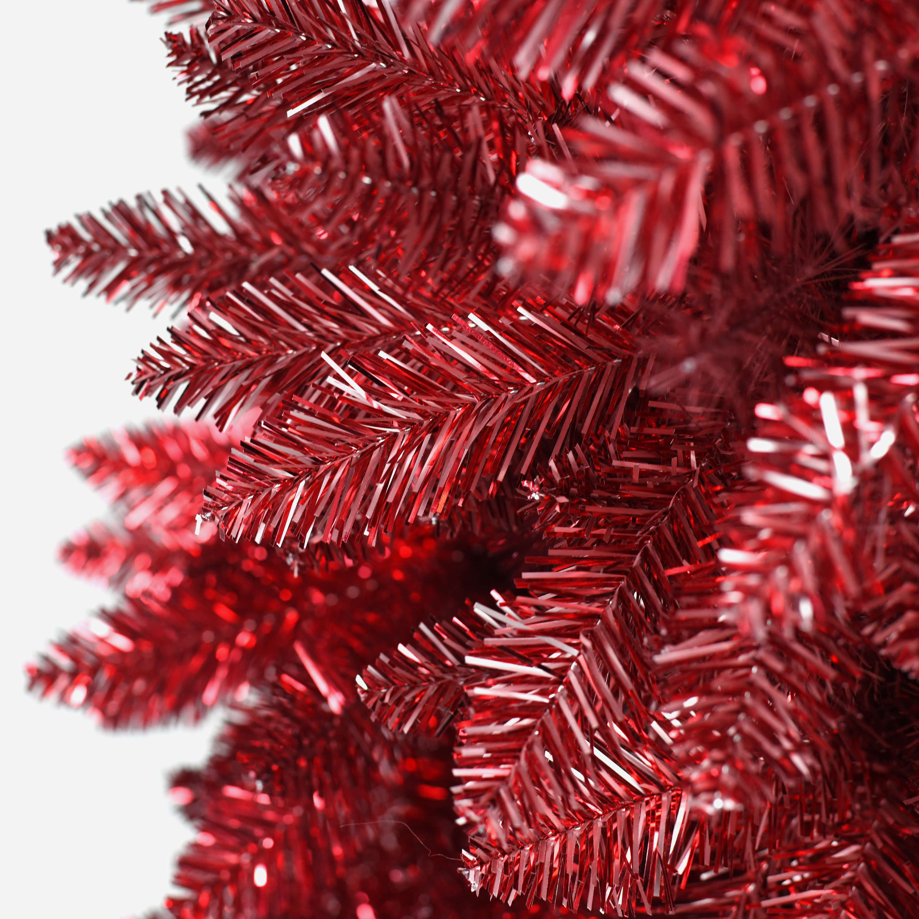 Abete di plastica/Albero di Natale finto LAS VEGAS SPEED di colore rosso con supporto in metallo e fatto di aghi in PVC. L'albero di Natale sintetico alto ca. 150 cm ha un diametro di ca. 75 cm ed è adatto come decorazione per il soggiorno di casa o per ristoranti, vetrine, stand fieristici, ecc.