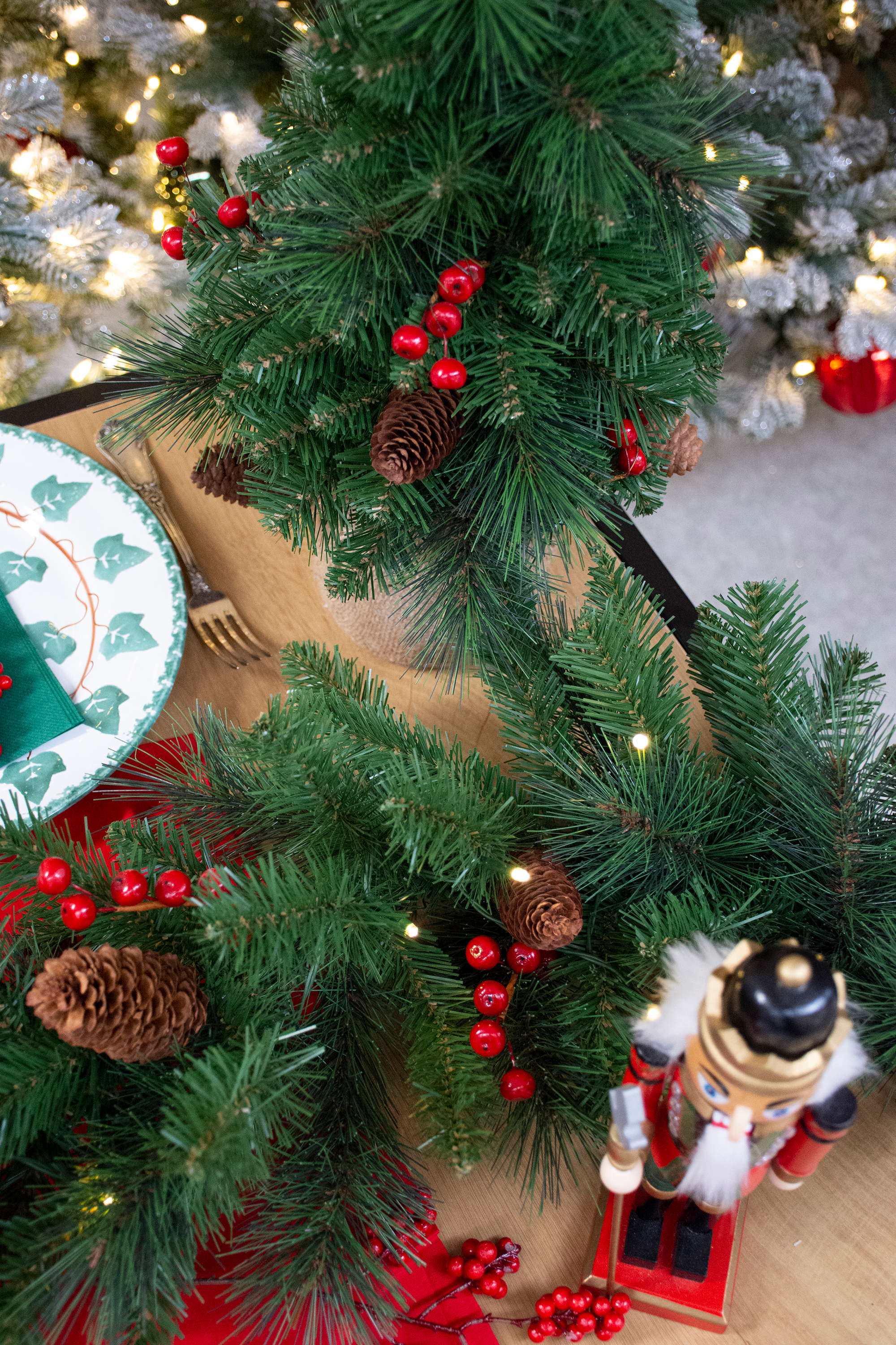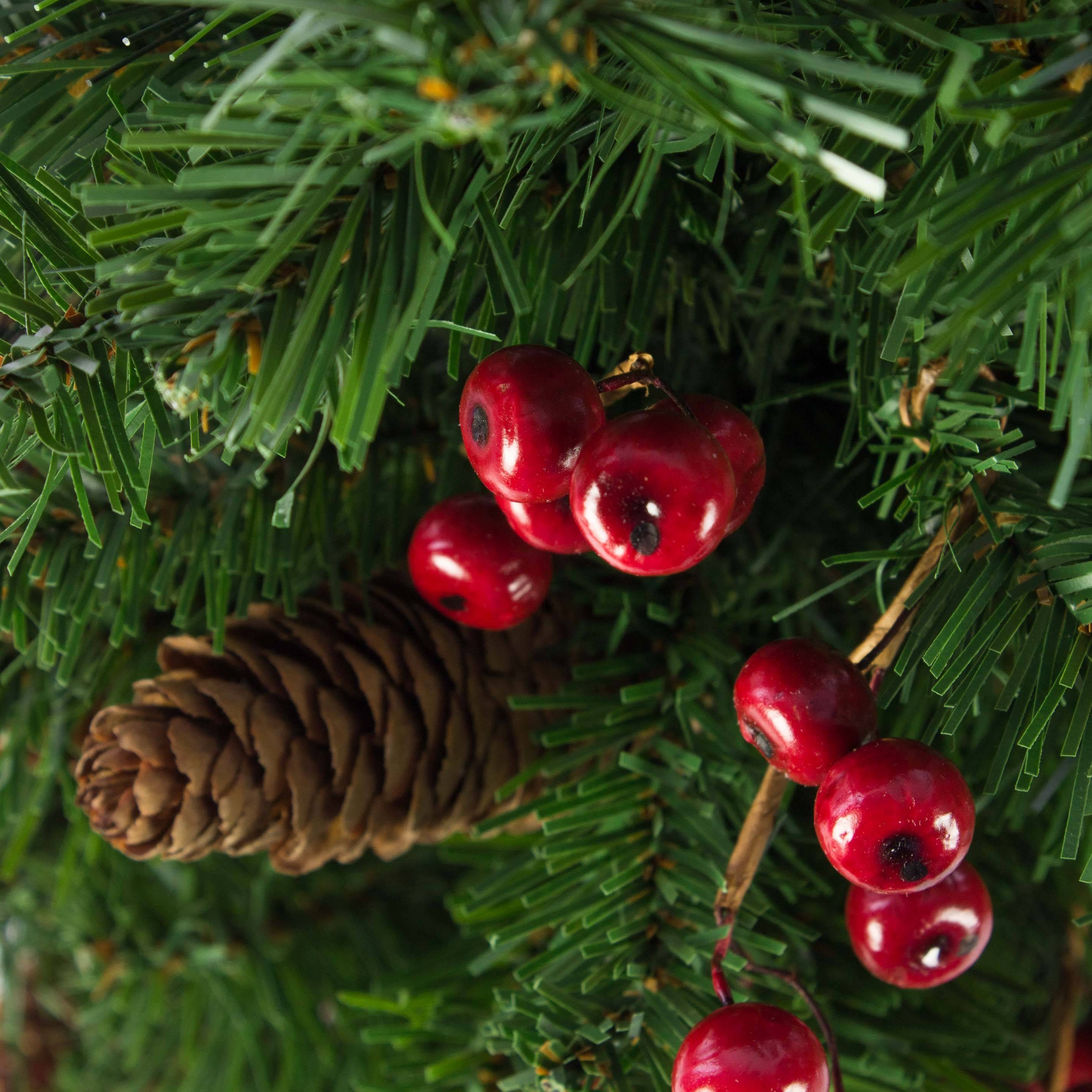 - Ca. 75 rametti pieghevoli di colore verde, decorati con bacche di ribes rosso e pigne.