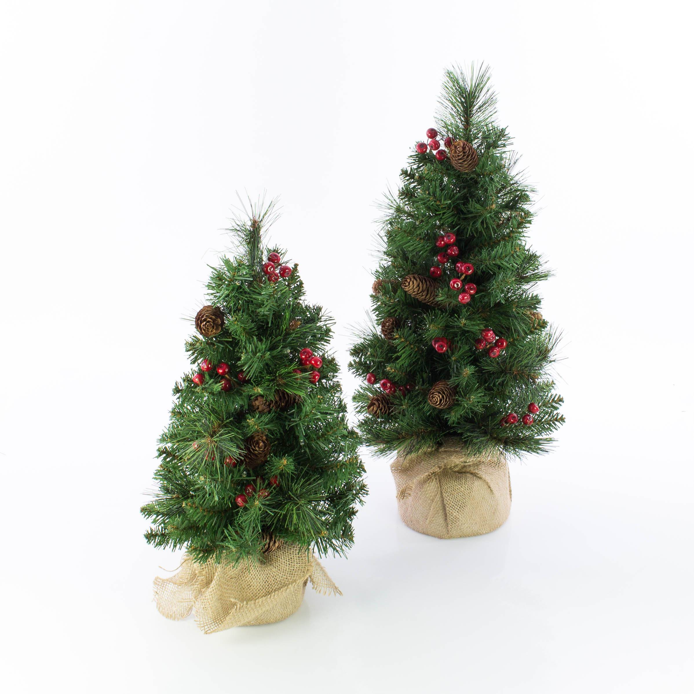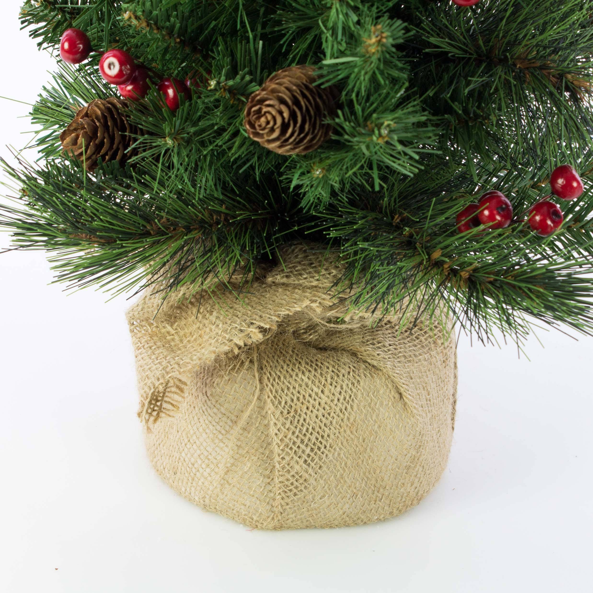 Alberello di Natale artificiale BUKAREST decorato con ribes rossi e pigne. I rametti aghiformi verdi sono flessibili e saldamente fissati al fusto. L'abete decorativo alto ca. 45 cm e largo 25 cm viene consegnato comprensivo di sacchetto in juta marrone.