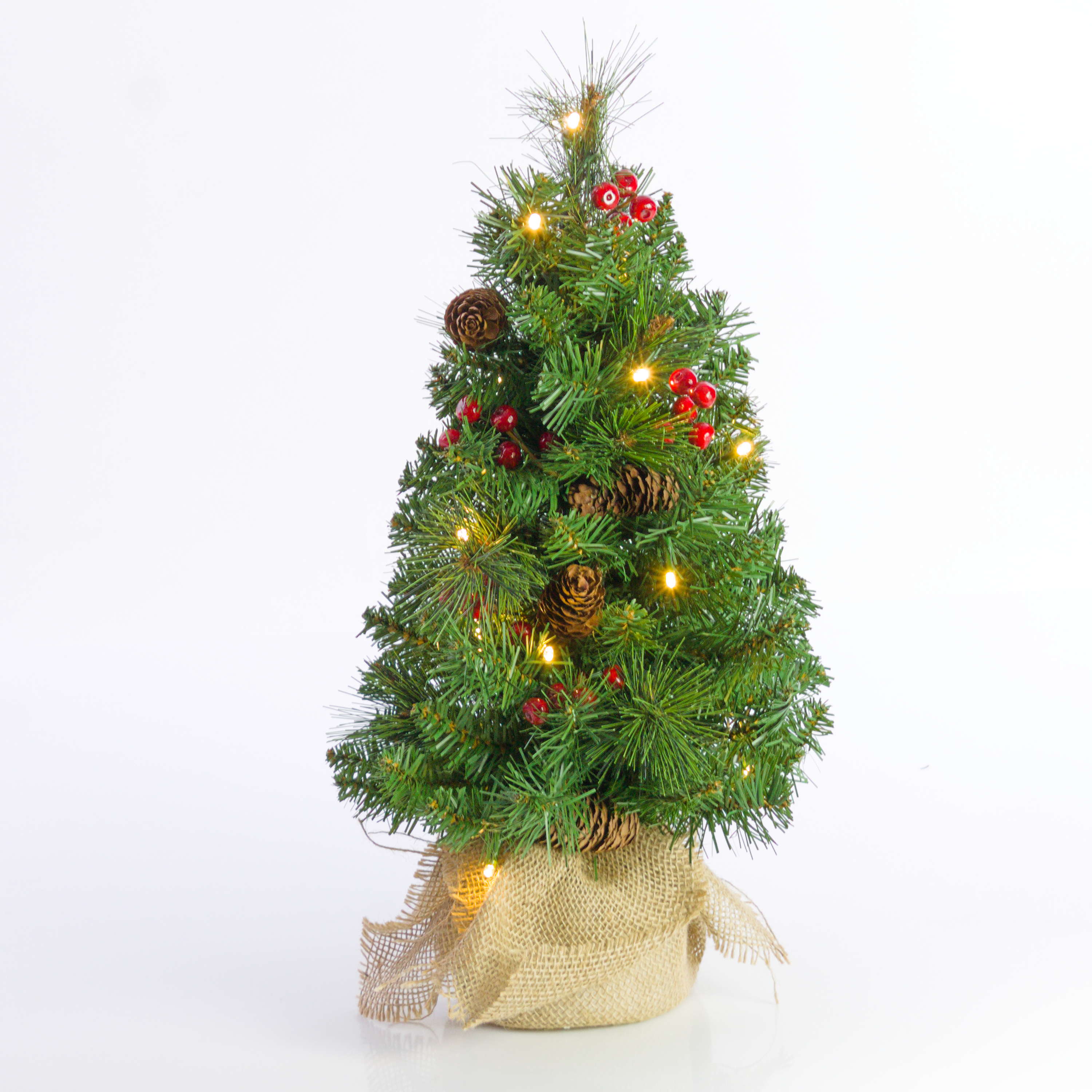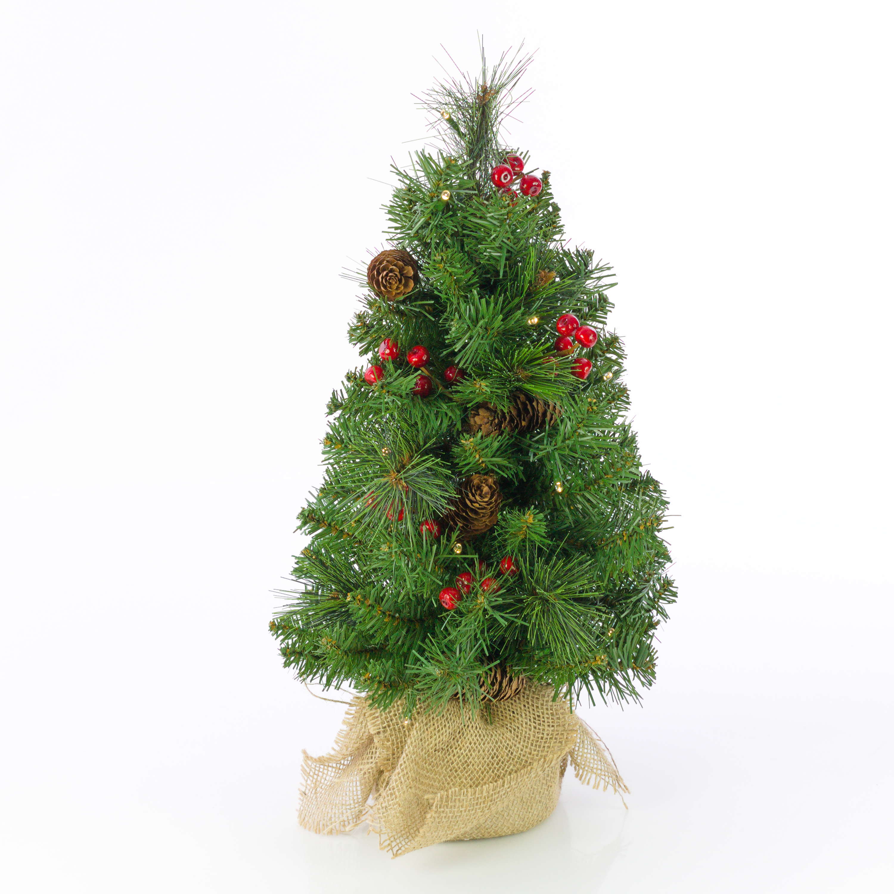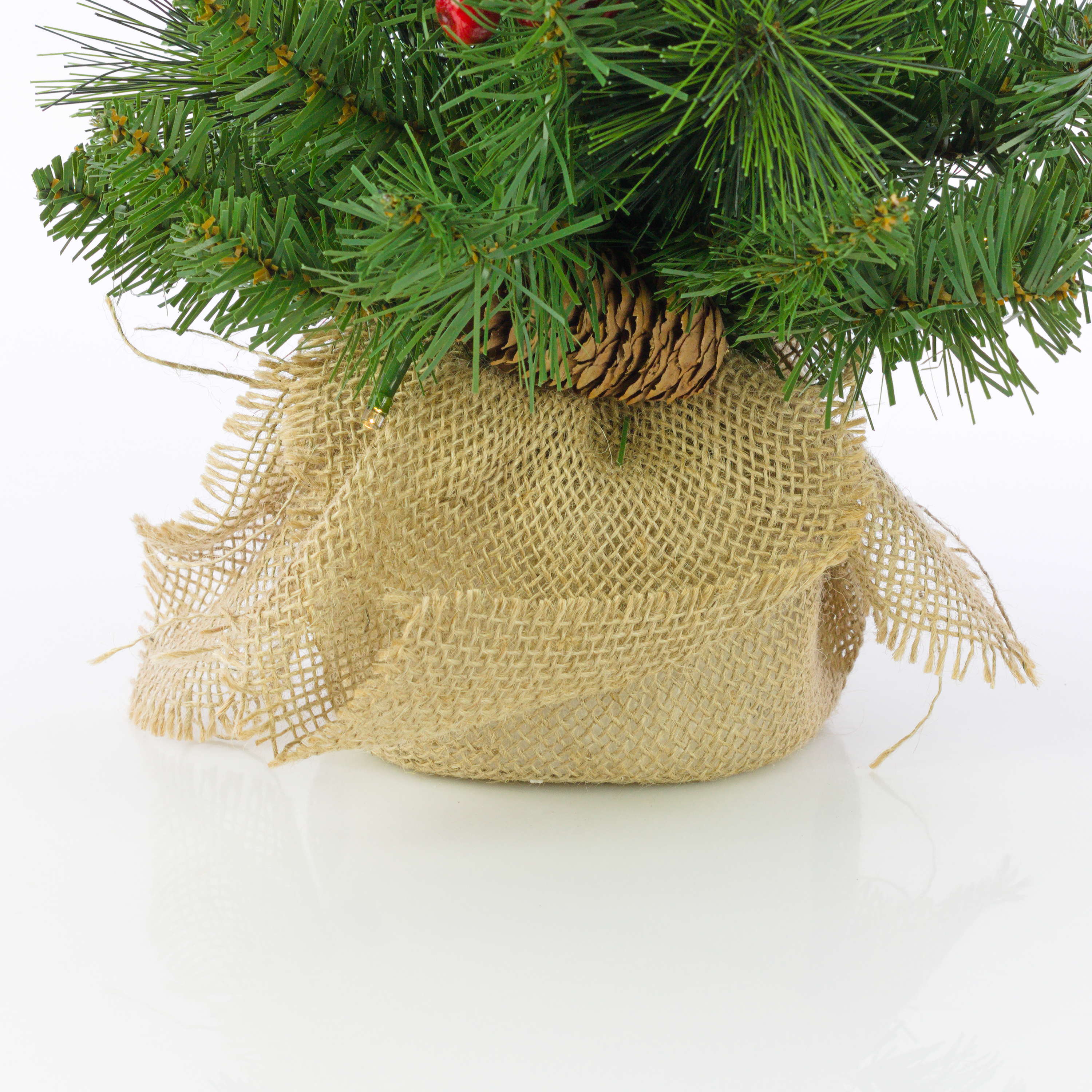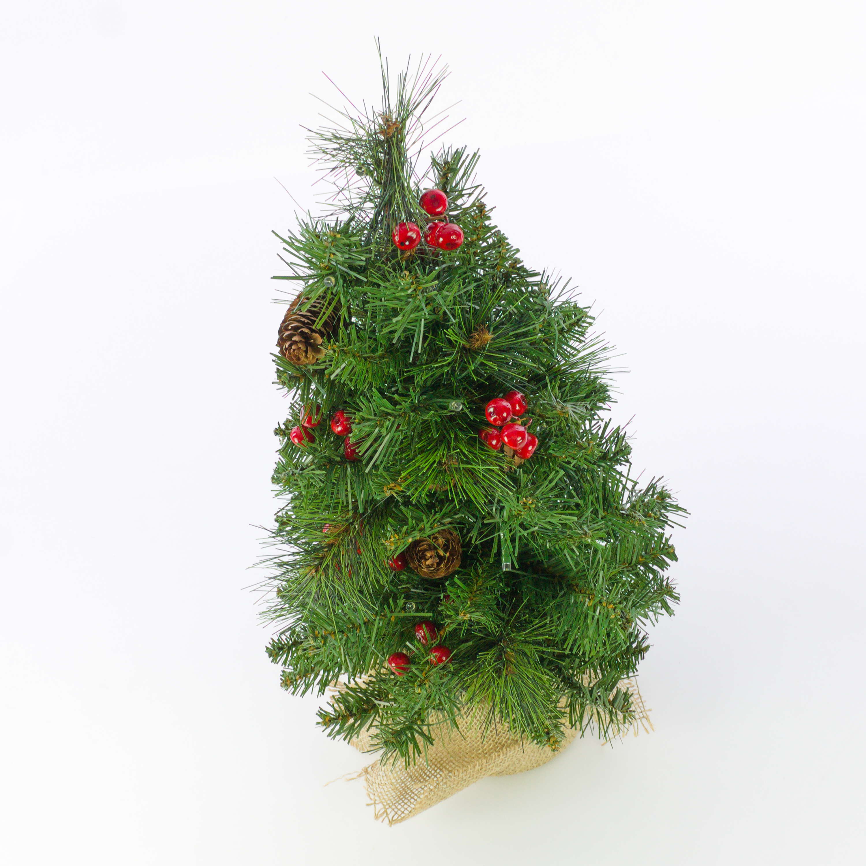 Alberello di Natale artificiale BUKAREST decorato con ribes rossi, pigne e 15 lucine. I rametti aghiformi verdi sono flessibili e saldamente fissati al fusto. L'abete decorativo alto ca. 45 cm e largo 25 cm viene consegnato comprensivo di sacchetto in juta marrone.