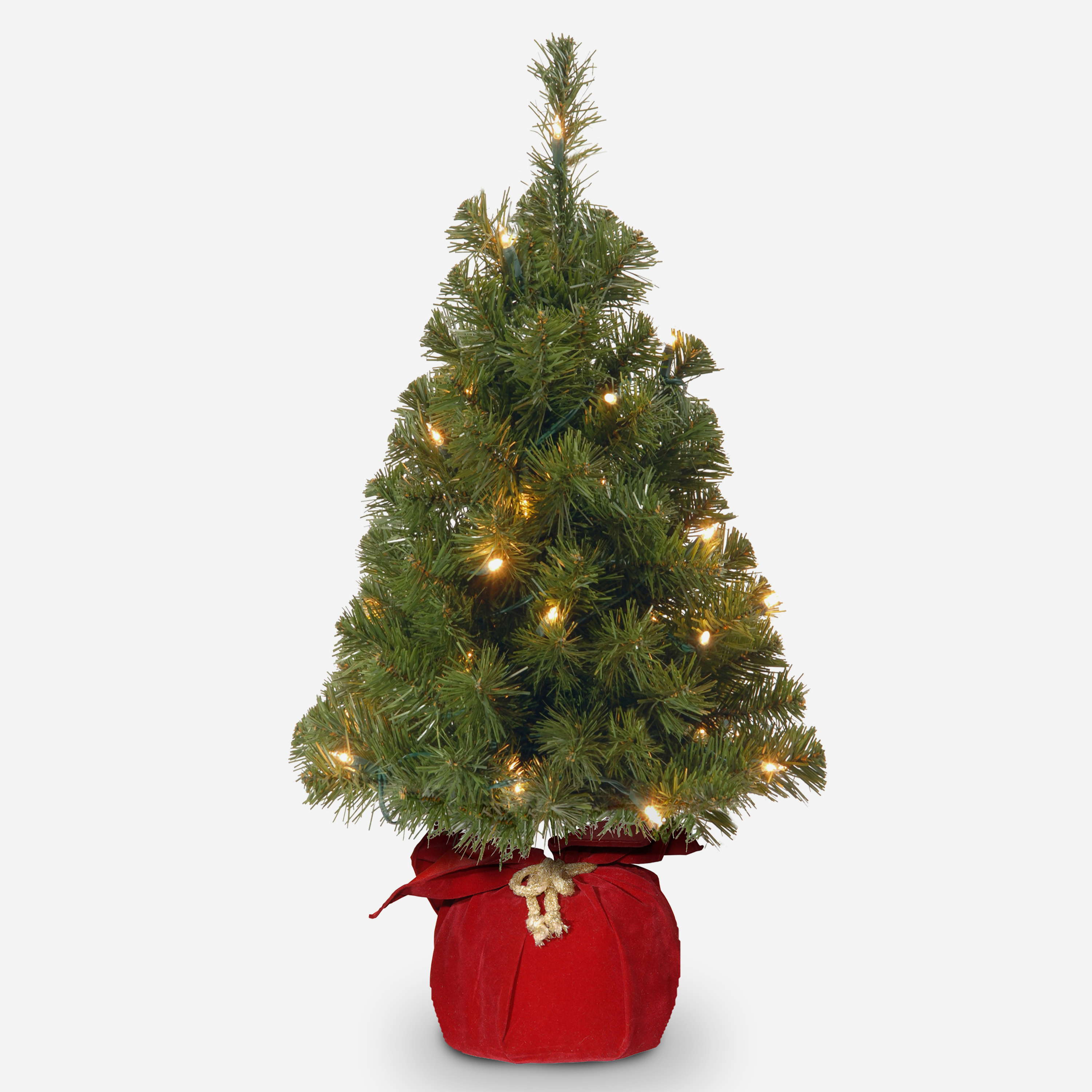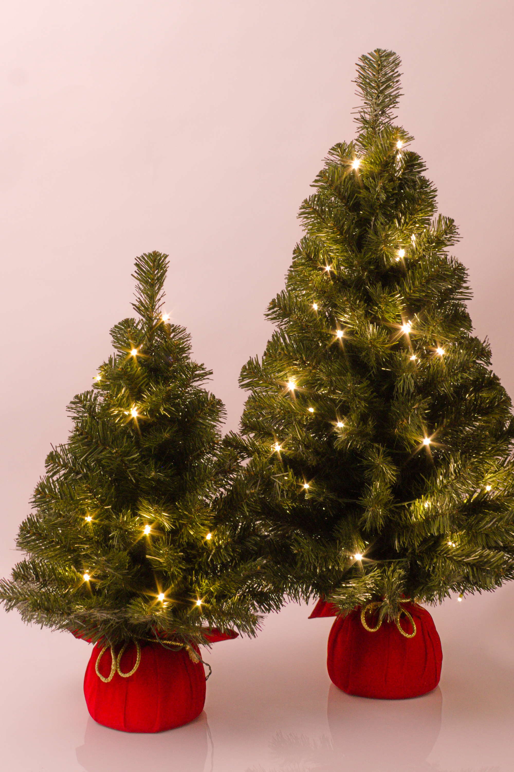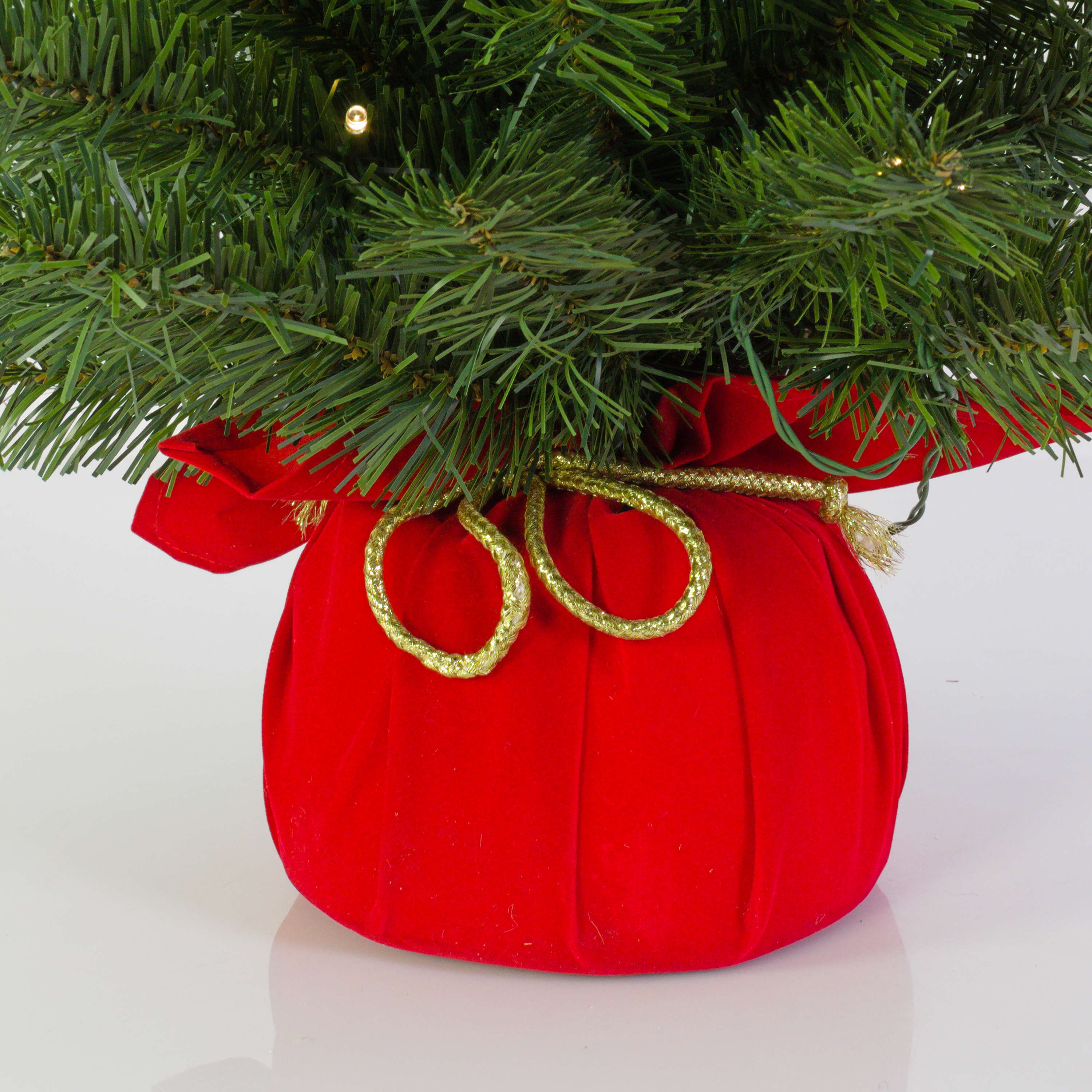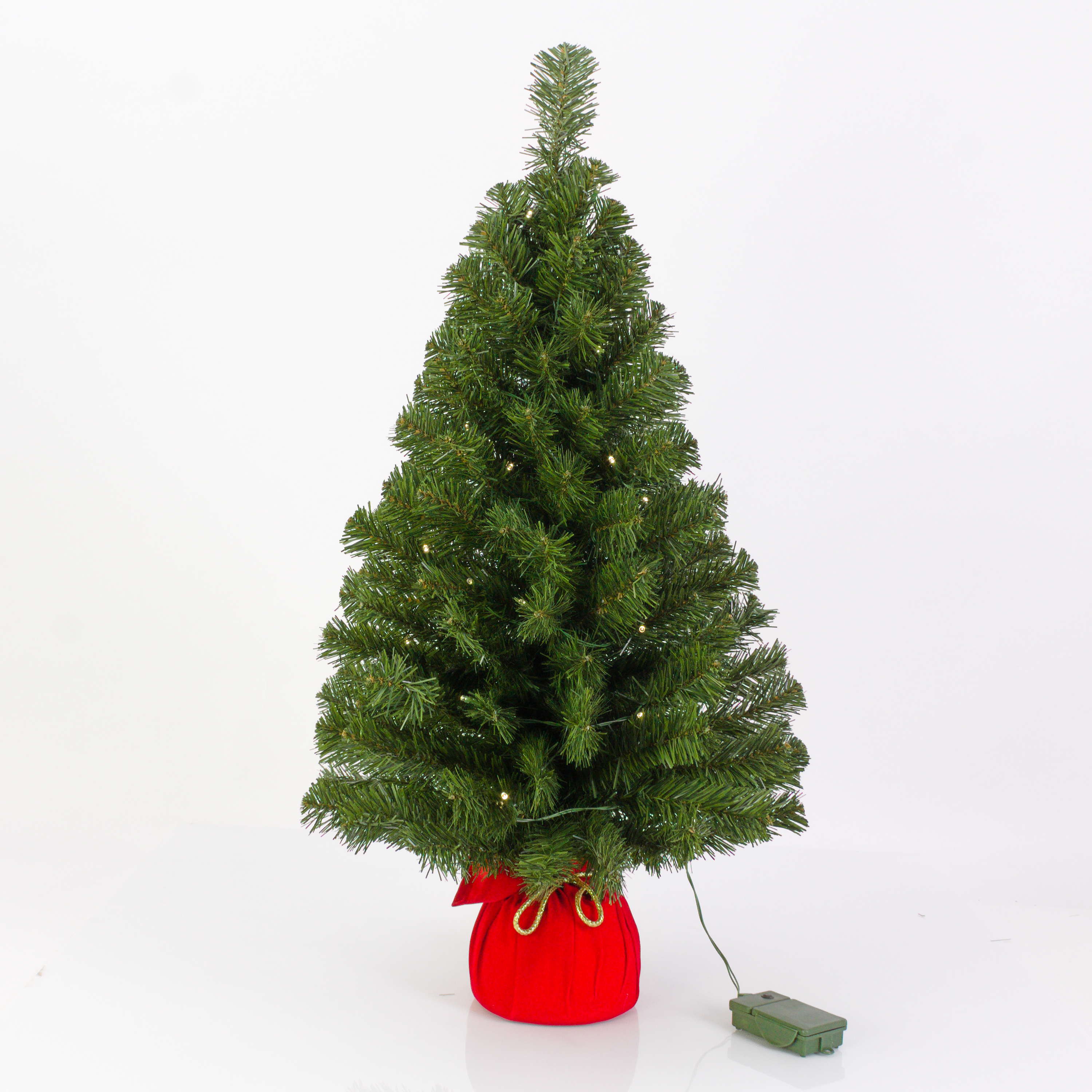 Abete finto WARSCHAU, sacco di iuta rosso, LEDs, 90cm, Ø50cm
