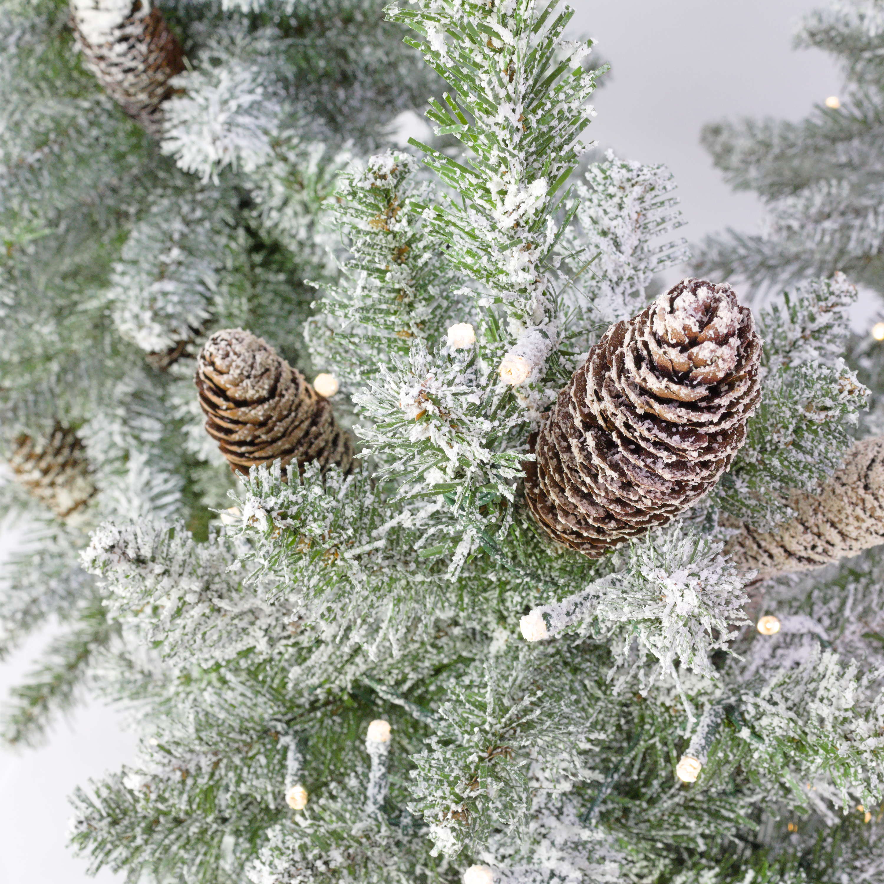 - Con ca. 75 rametti verdi scuri di alta qualità in fibra tessile in PVC, gli aghi tessili misurano ca. 2 cm in lunghezza e i rami sono ricoperti di neve artificiale, resistenti e saldamente fissati al fusto; l’albero è dotato anche di alcune pigne marroni