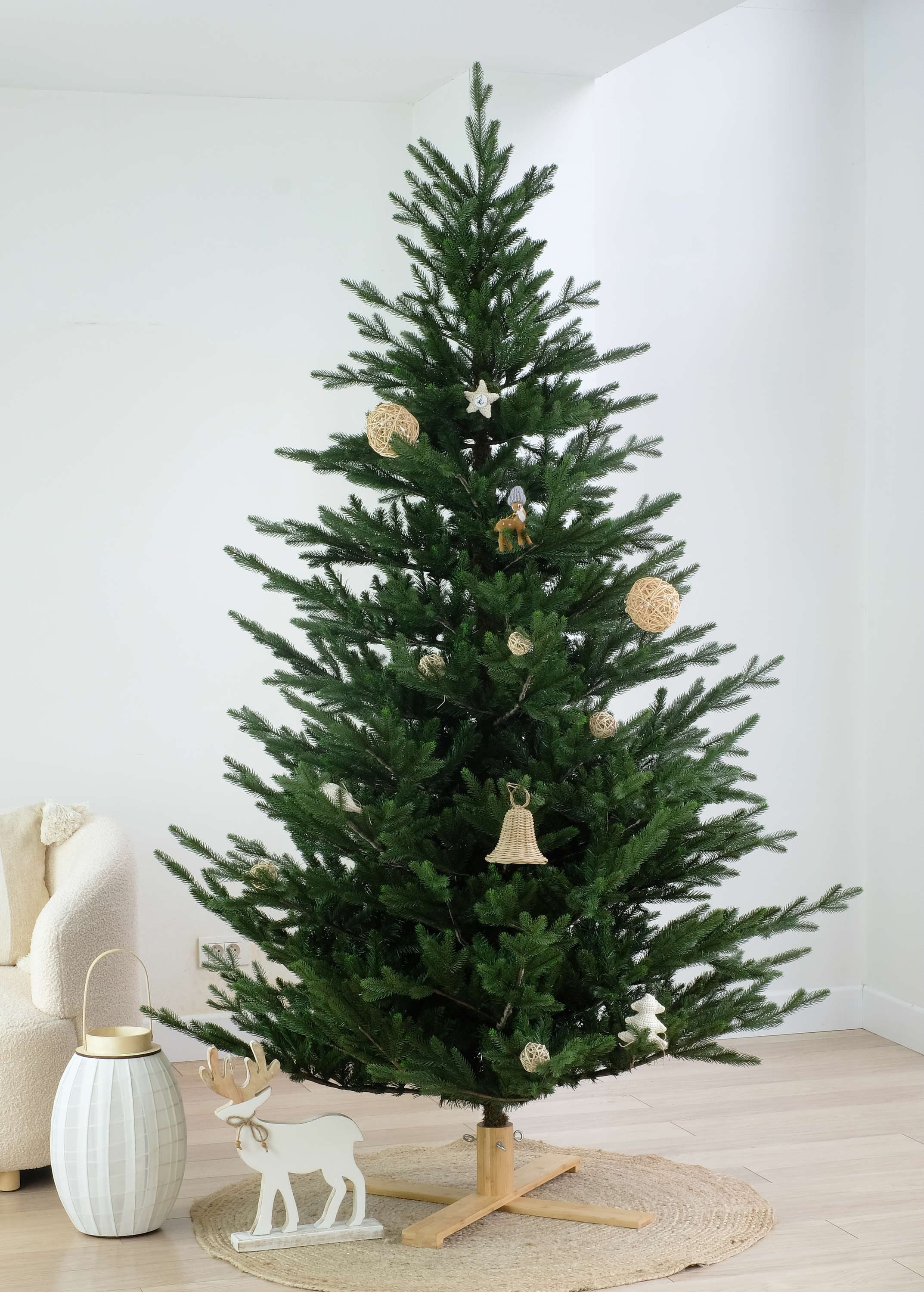 Abete/Albero di Natale artificiale VALLETTA di colore verde con supporto in legno composto da aghi in PE/PVC. L'abete natalizio alto ca. 230 cm ha un diametro di ca. 140 cm ed è adatto come decorazione per soggiorni o ristoranti, vetrine, stand fieristici, ecc.