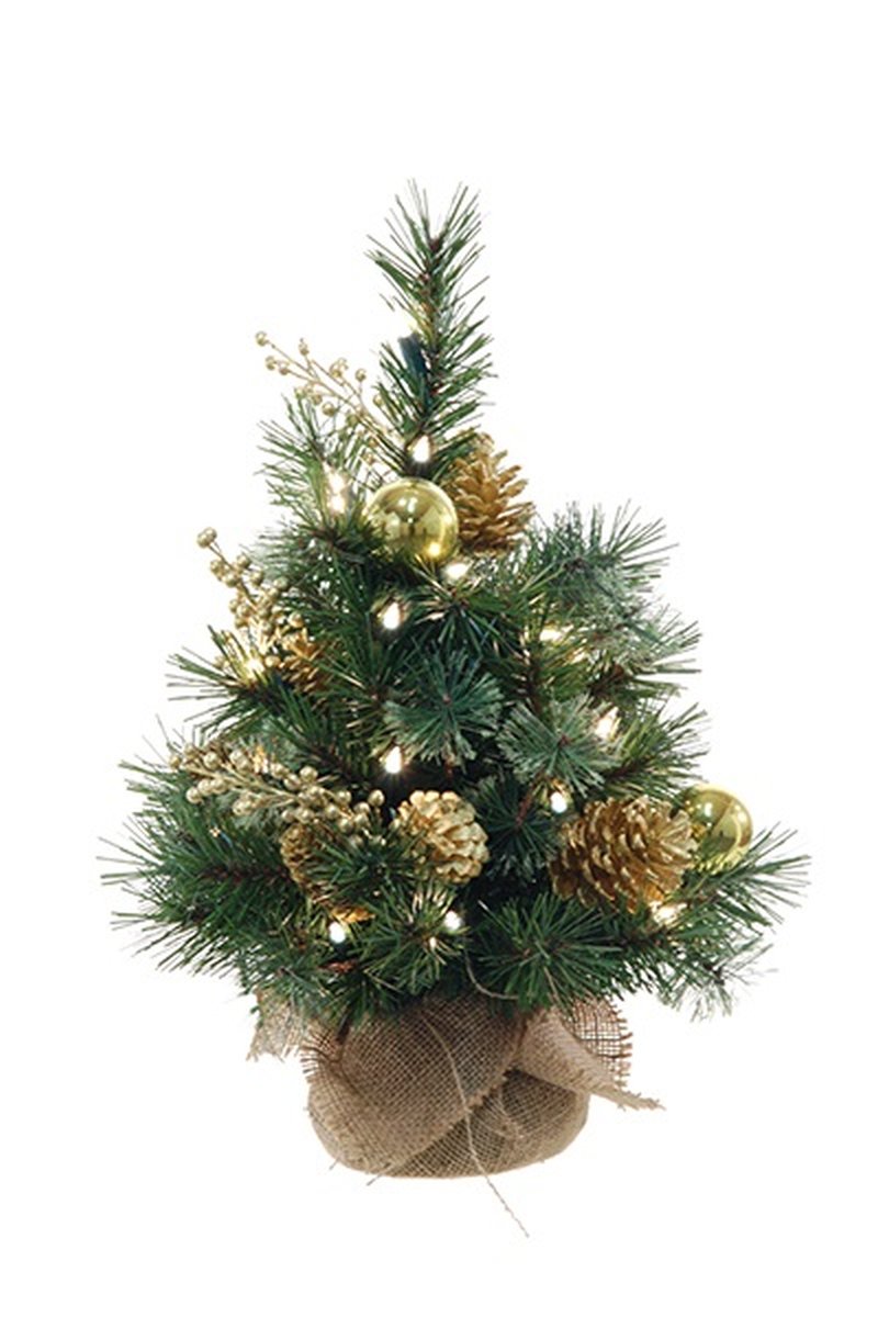 Albero di Natale artificiale CEDO, sacco di iuta, pigne, bacche, LED, verde-oro, 45cm