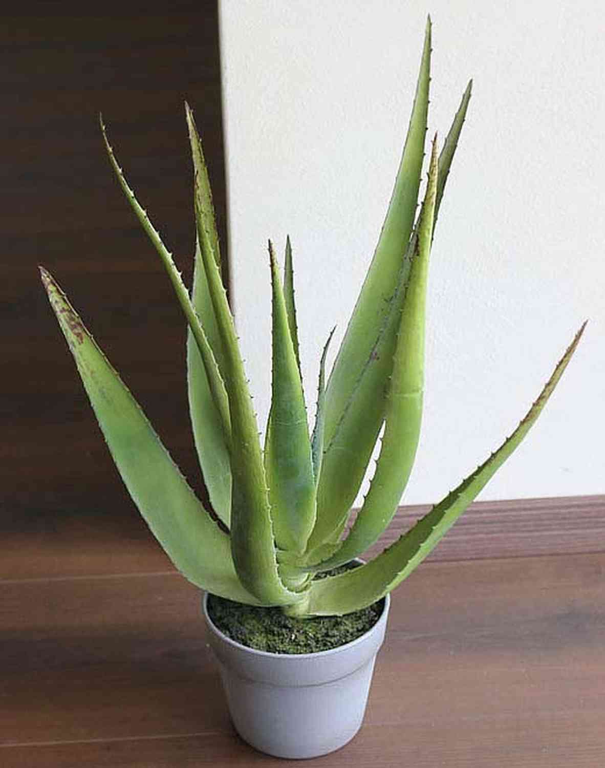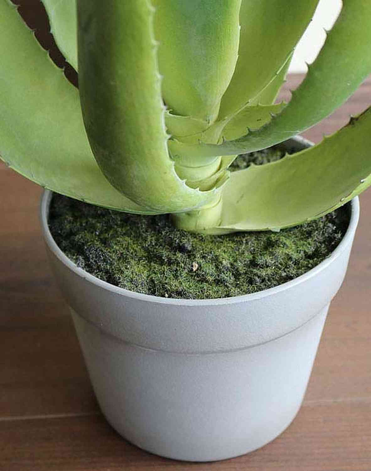 Aloe decorativa NAMIKA in vaso moderno. La pianta artificiale misura un'altezza totale di 50 cm ed è piantata in terriccio decorativo.