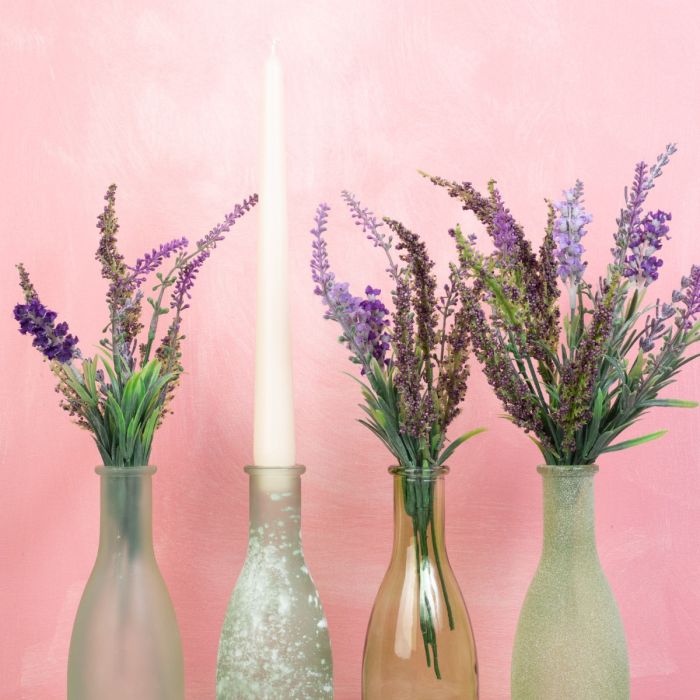 Lavanda a lume di candela! Le diverse tonalità di verde delle bottiglie si adattano alle diverse tonalità di viola della lavanda. Una candela a bastoncino color crema spicca con decisione e sottolinea i toni del viola e del verde. Si può creare una romantica decorazione da tavolo o cassettiera. Per serate lunghe, accoglienti e indimenticabili. Volete anche dare un nuovo splendore al vostro spazio abitativo? Acquistate il look!