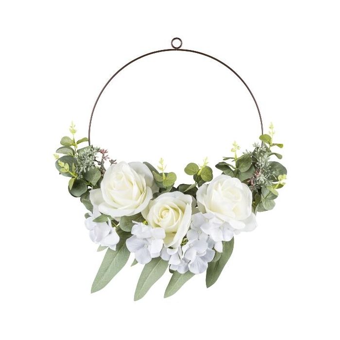 Anello floreale artificiale rosa, ortensia, eucalipto TREMO, bianco, Ø 50 cm