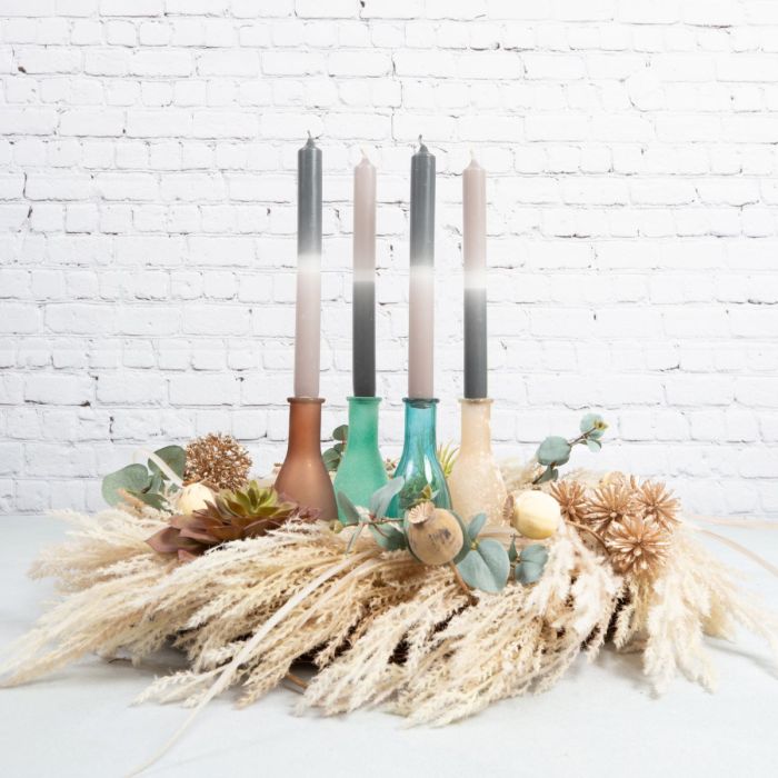 Consiglio per il design: tagliare bene l'erba pampa dalla corona. Accorciate i rami decorativi e inseriteli nella corona. Assicuratevi che siano distribuiti in modo uniforme. Sistemate le bottiglie con le candele in modo che le candele dip-dye si alternino nei colori.