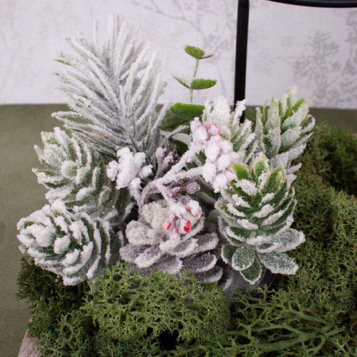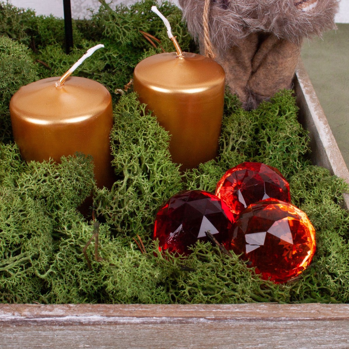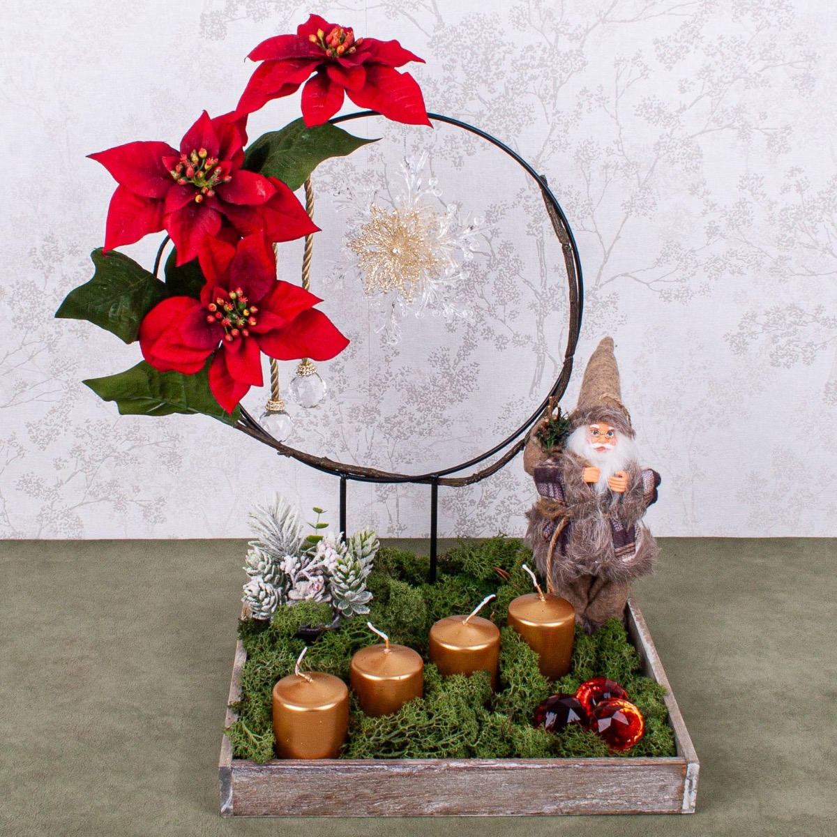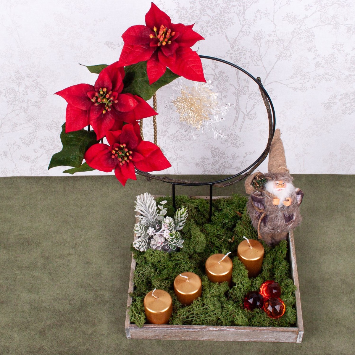 Rosso, verde e dorato! Questi colori sono semplicemente sinonimo di Natale e sono davvero indispensabili in questo periodo speciale dell'anno. La nostra insolita corona dell'Avvento è stata progettata con grande attenzione ai dettagli. Un vassoio riempito di muschio naturale verde scuro sembra il pavimento di una foresta. Il piccolo Babbo Natale si sentirà a casa sua. I diamanti in vetro acrilico e la composizione natalizia innevata fungono da decorazioni e completano perfettamente il look. L'anello metallico autoportante è perfetto per fissare le decorazioni natalizie. La stella di Natale rossa e i pendenti natalizi dorati sono semplicemente fantastici e si abbinano perfettamente a questo design rustico. Acquistate il look!