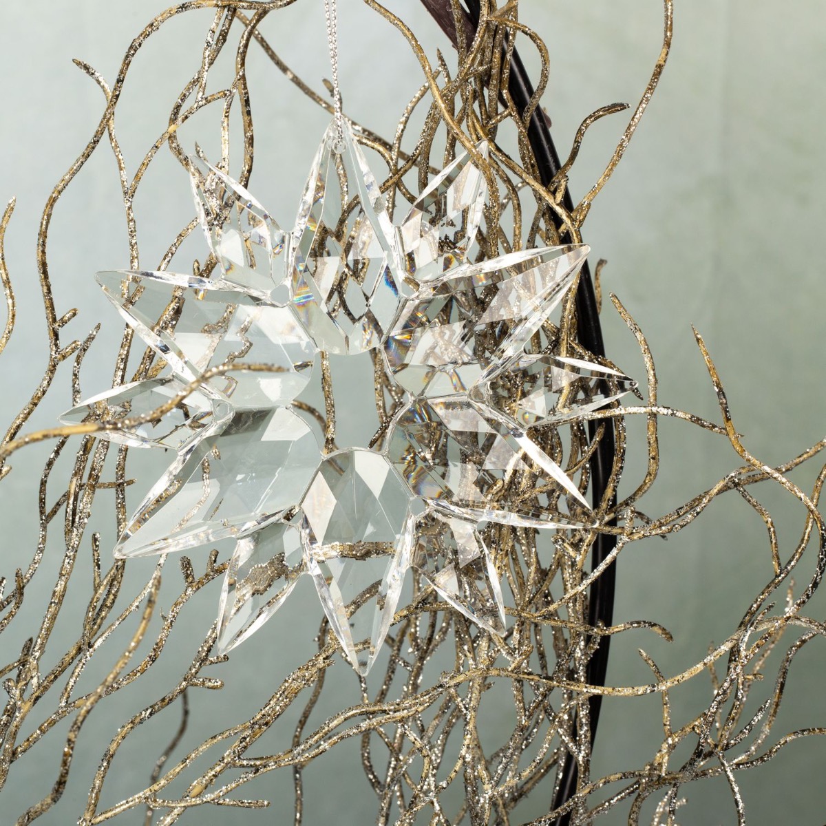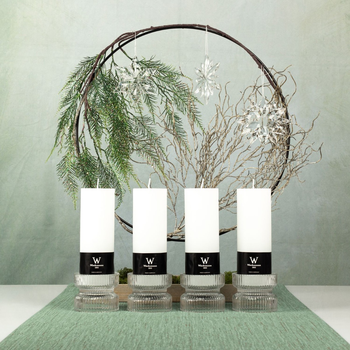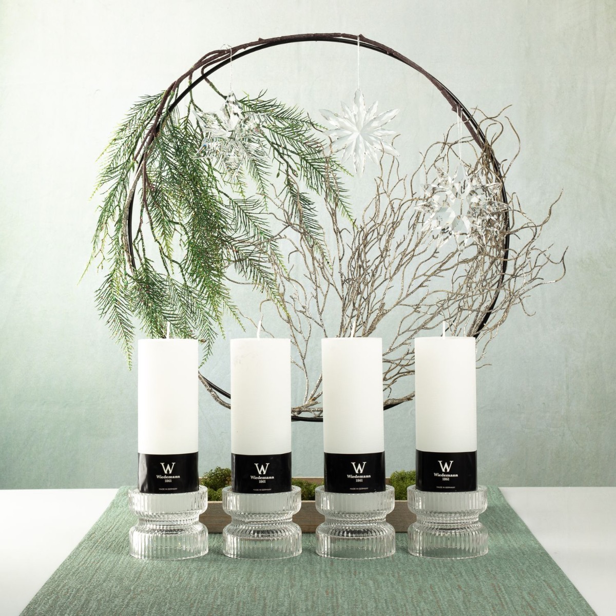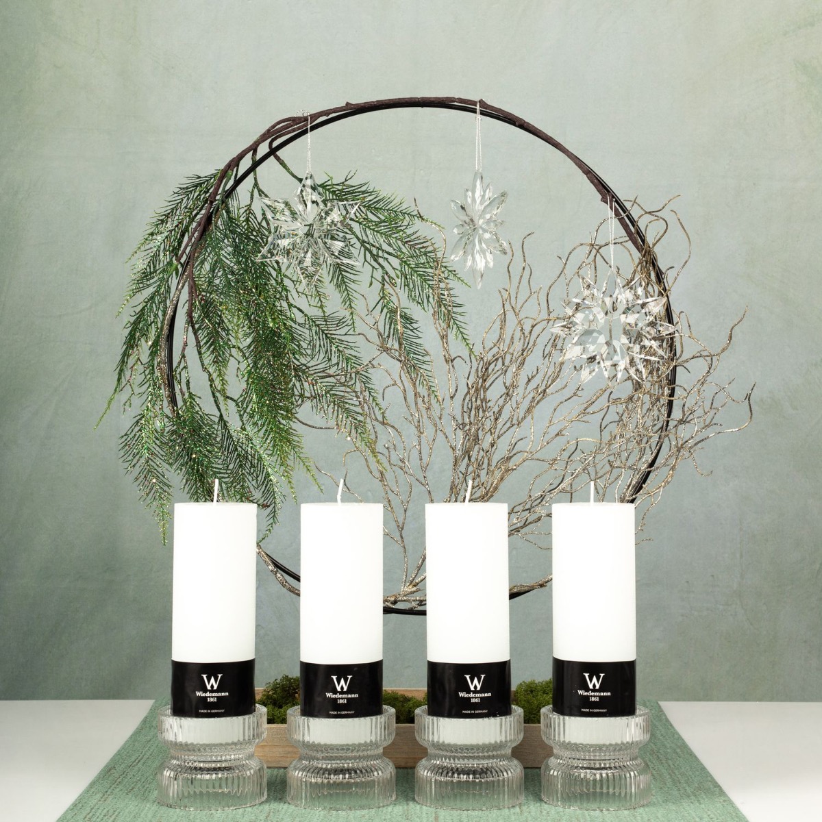 Consiglio per la decorazione: Posizionate prima l'anello di metallo sul vassoio e poi riempitelo di muschio naturale. Avvolgete l'anello con i rami e decoratelo con le stelle acriliche. Le candele sono posizionate simmetricamente davanti alla composizione, poiché sono l'elemento principale di questo look.