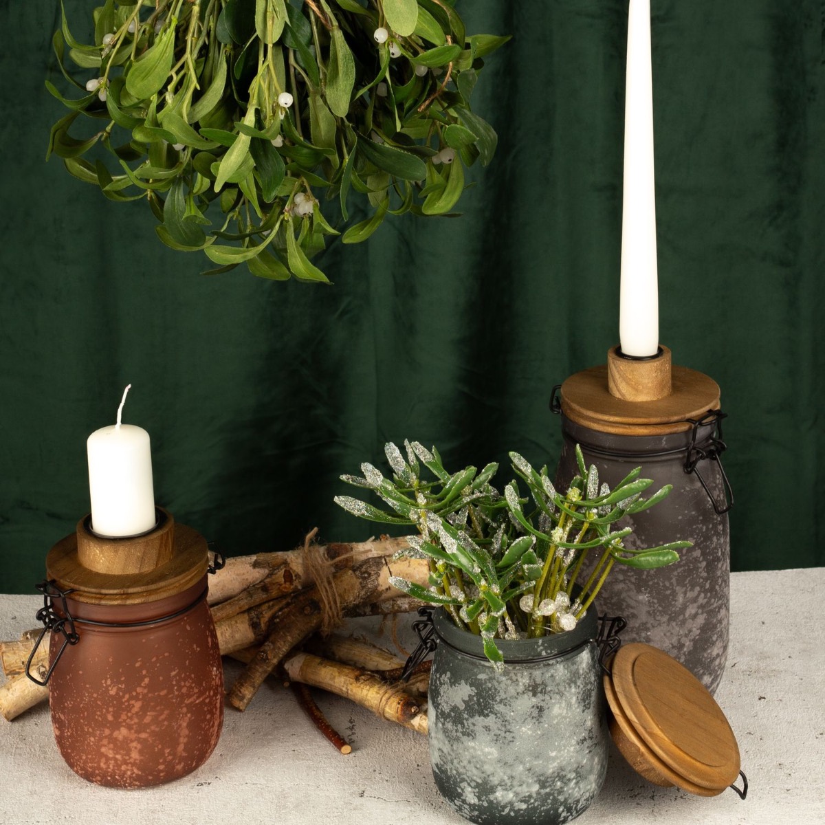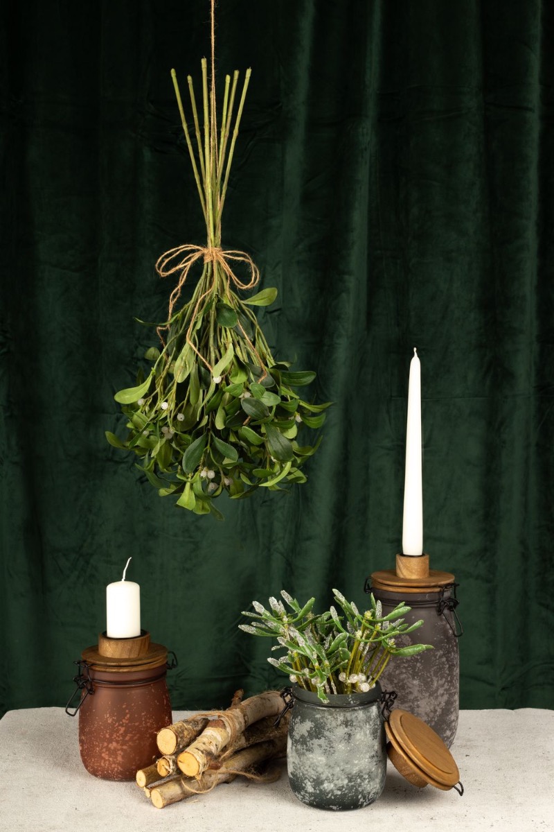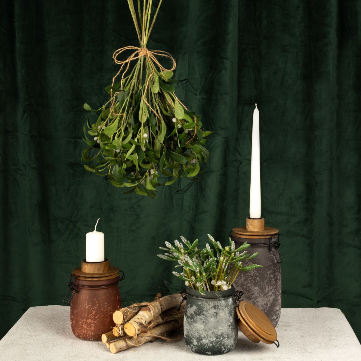Eleganza e tradizione! I nostri portacandele dal design invernale shabby chic sono perfetti per una decorazione invernale festosa. La doppia funzione di questi vasetti è particolarmente pratica. Una volta come portacandele e una volta come vaso per i nostri bouquet di vischio innevato. Con questo look abbiamo dato uno sguardo alla tradizione del vischio. Il vischio è una delle poche piante che fiorisce anche in inverno e ha una tradizione davvero romantica. Se una coppia si bacia sotto il vischio, porta fortuna. Se una donna single si trova sotto il vischio, non dovrebbe rifiutare un bacio. Quindi, attenzione donne single! Acquistate il look!