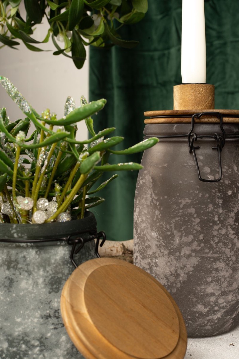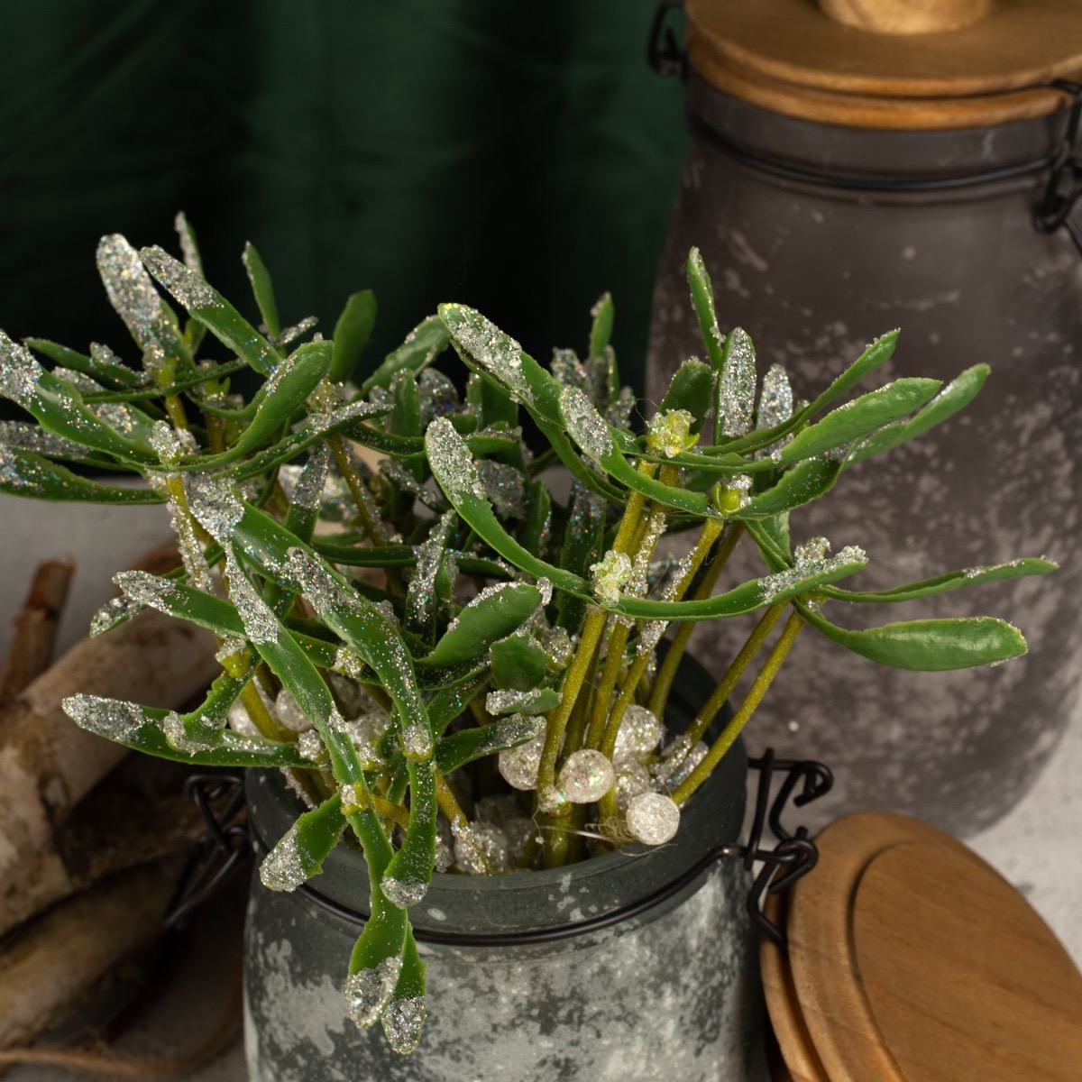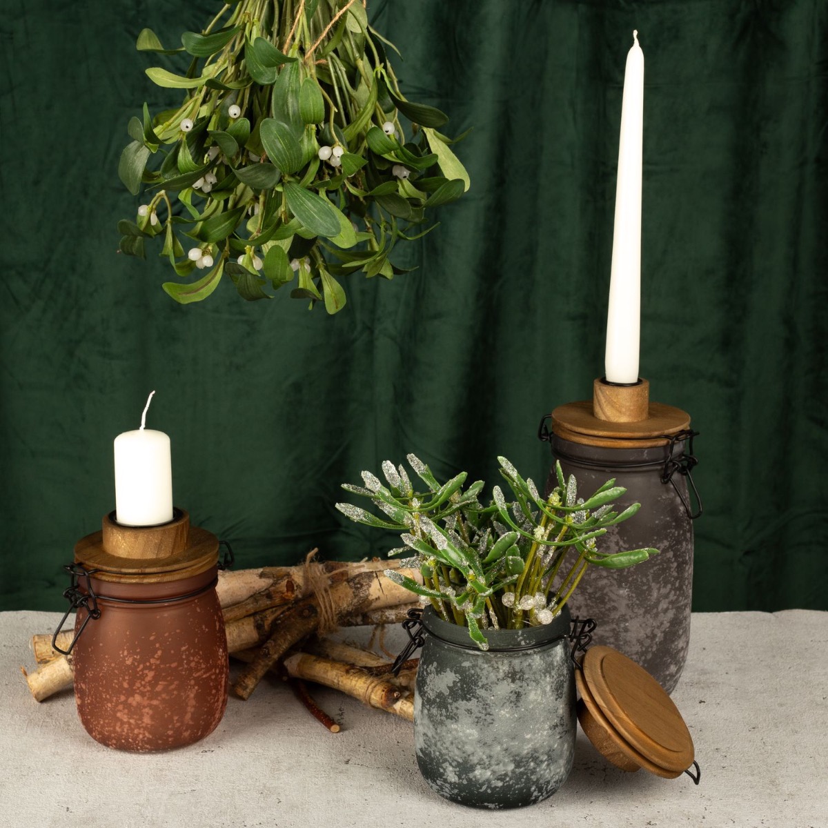 Eleganza e tradizione! I nostri portacandele dal design invernale shabby chic sono perfetti per una decorazione invernale festosa. La doppia funzione di questi vasetti è particolarmente pratica. Una volta come portacandele e una volta come vaso per i nostri bouquet di vischio innevato. Con questo look abbiamo dato uno sguardo alla tradizione del vischio. Il vischio è una delle poche piante che fiorisce anche in inverno e ha una tradizione davvero romantica. Se una coppia si bacia sotto il vischio, porta fortuna. Se una donna single si trova sotto il vischio, non dovrebbe rifiutare un bacio. Quindi, attenzione donne single! Acquistate il look!
