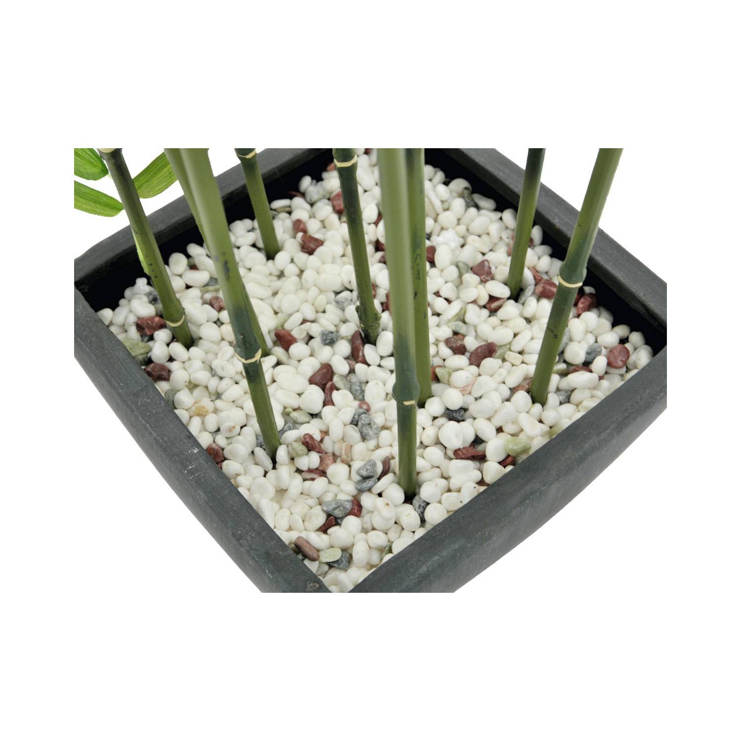 Bambú decorativo con fusti artificiali di colore bruno in ciotola decorativa nera. La chioma dell´albero artificiale si compone di fogliame in varie tonalitá di verde. Misura un´altezza complessiva di ca. 120cm.