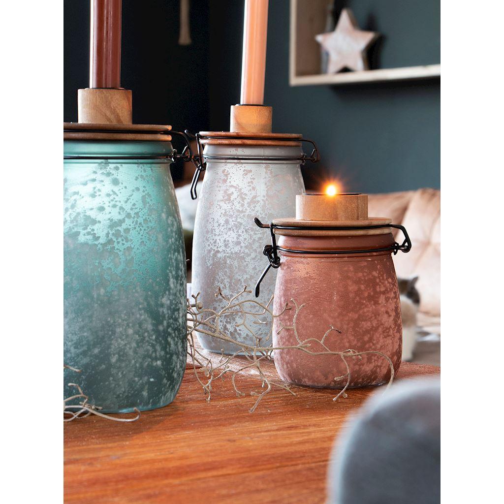 Barattolo con tappo mecanico ANNEDORE con portacandela tealight, effetto brina, ambra, 15,5cm, Ø10,5cm