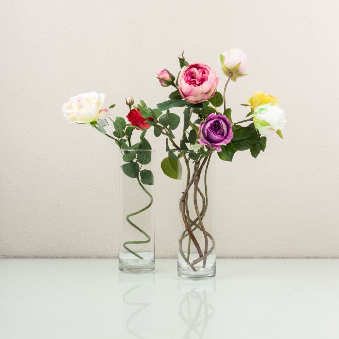 Colorato e pittoresco! Quando pensi ai fiori artificiali, pensi subito alle rose artificiali che puoi fotografare in una fiera. Ma sappiamo che esistono rose artificiali davvero eccezionali e di altissima qualità. Rose che sono quasi più belle di quelle vere. Le diverse rose sono curve in modo da risaltare rispetto ai vasi cilindrici e creare un'immagine divertente Acquista il look!< /p>.