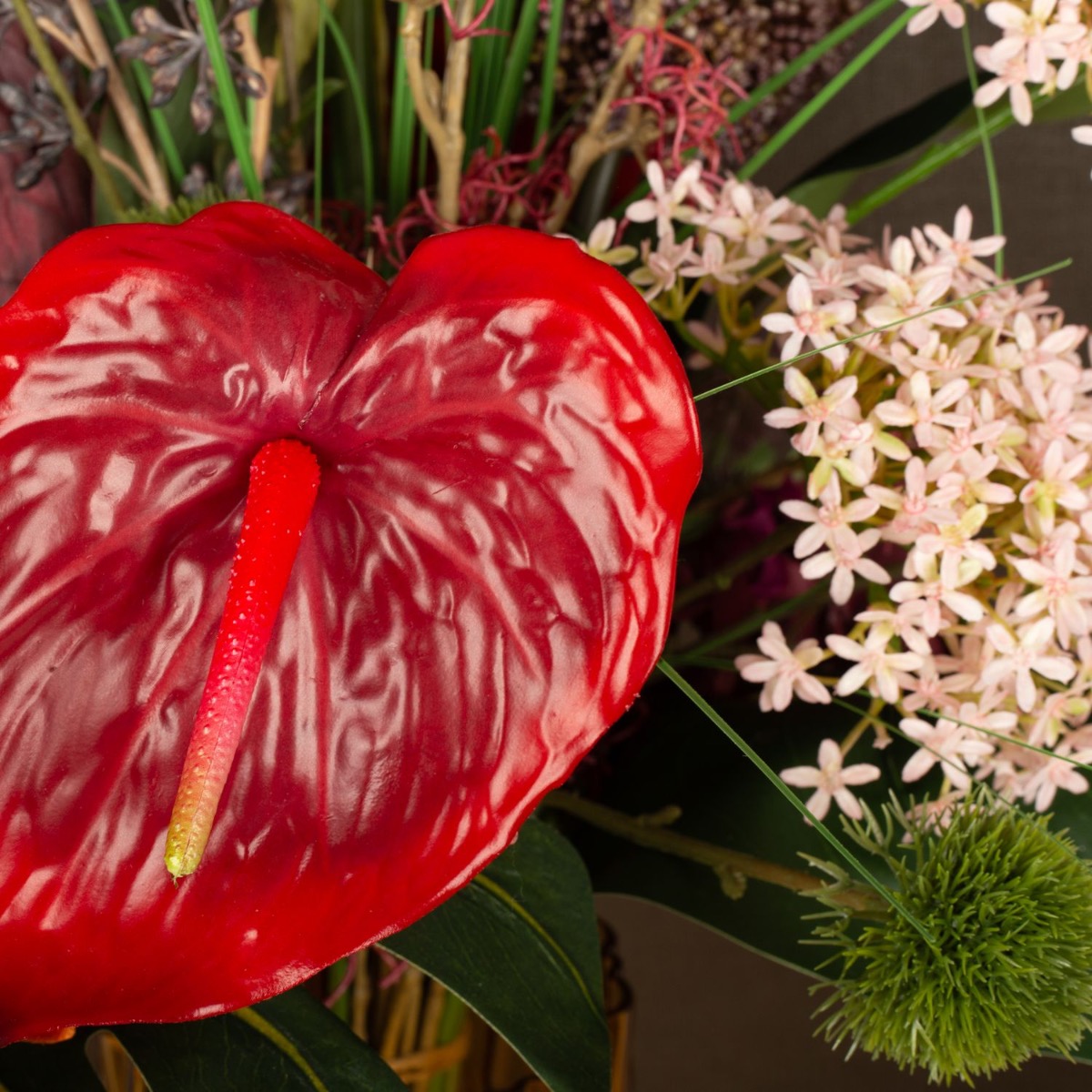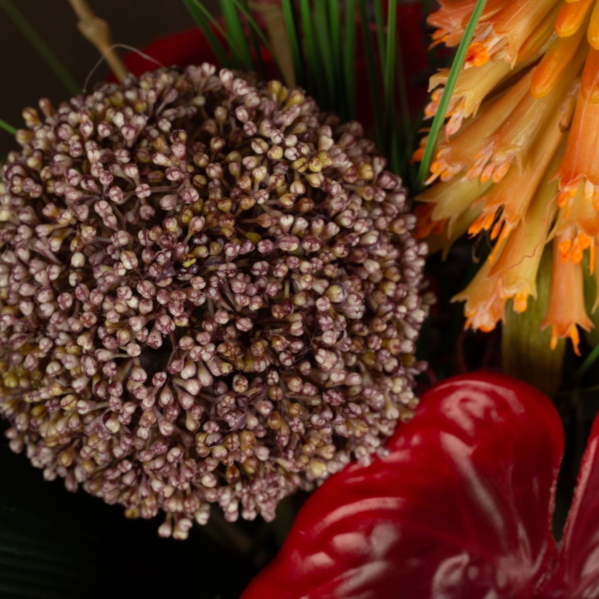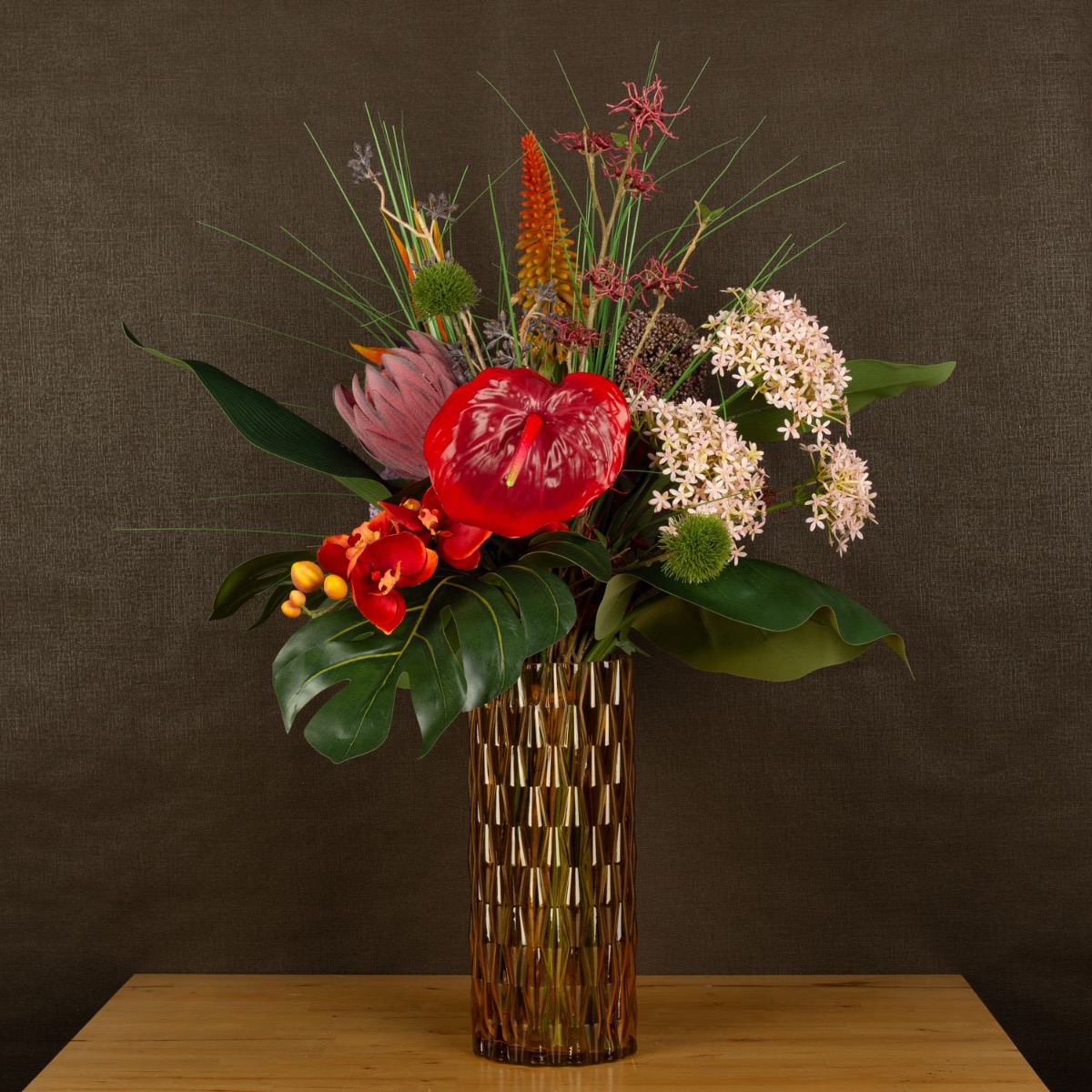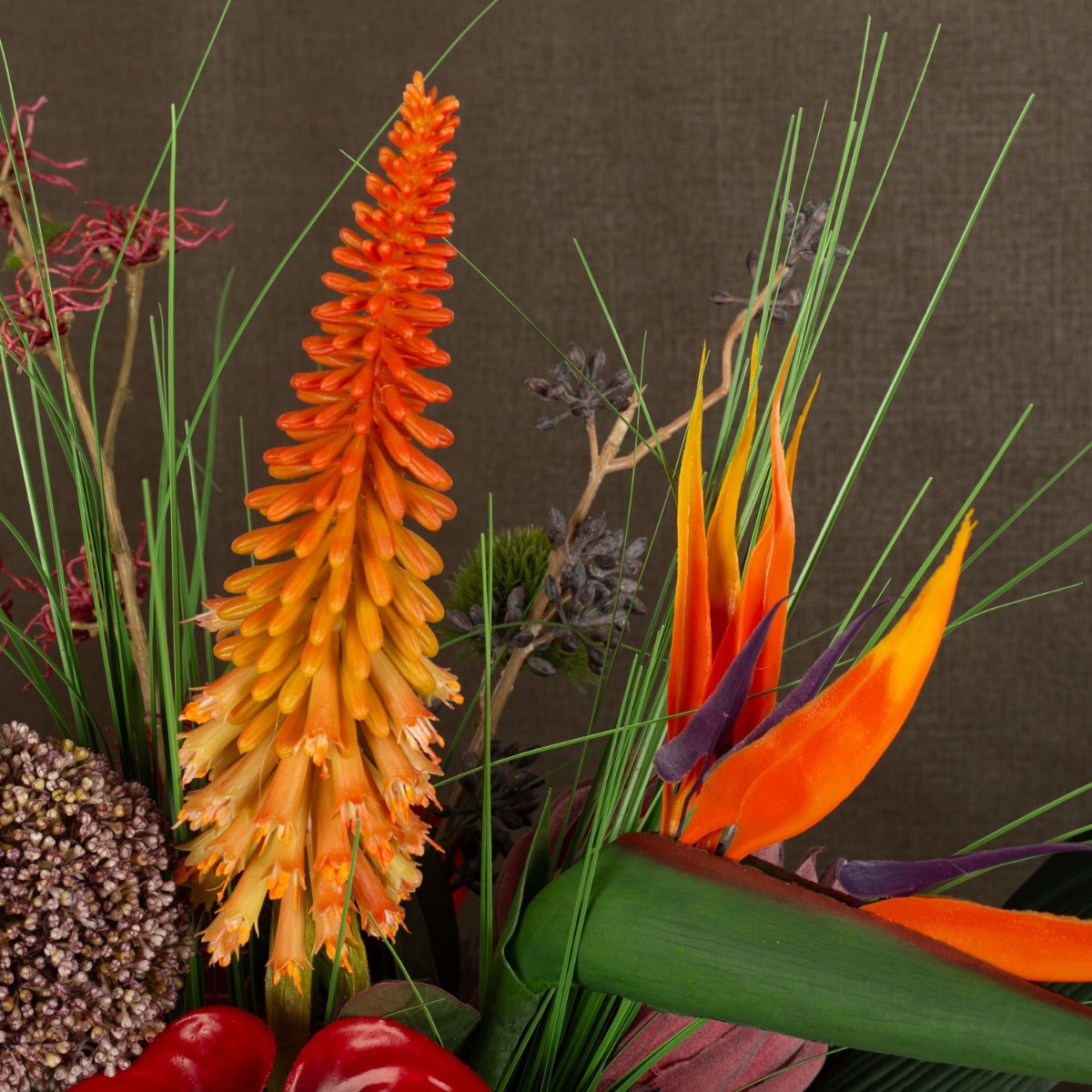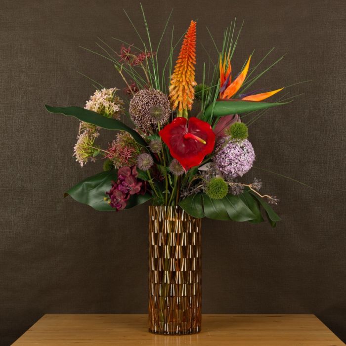 Strelitzia e Monstera! Una combinazione che rende esotico ogni bouquet. Anthurium, orchidee e kniphofia brillano in forti tonalità rosse e arancioni e danno vita al colore. Il vaso giallo-arancio crea con la sua struttura uno straordinario gioco di luce e fa risplendere il bouquet Acquista il look!