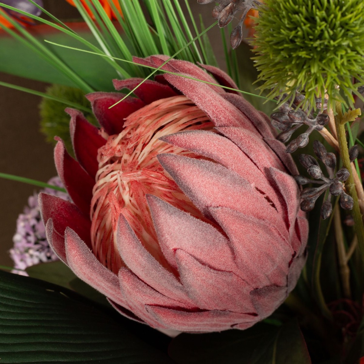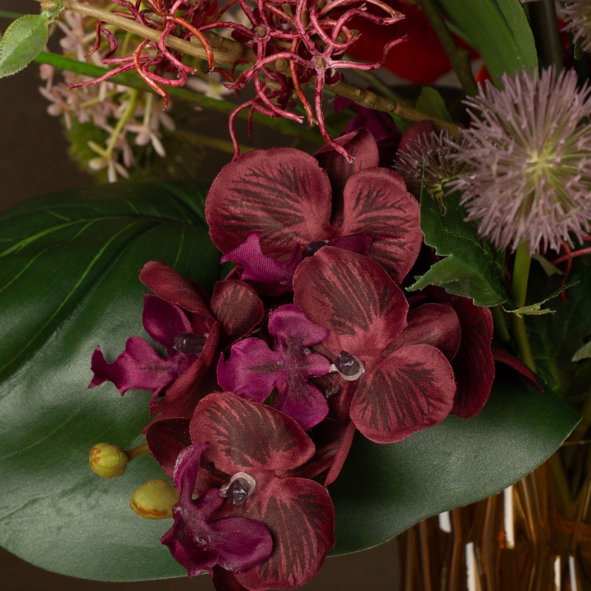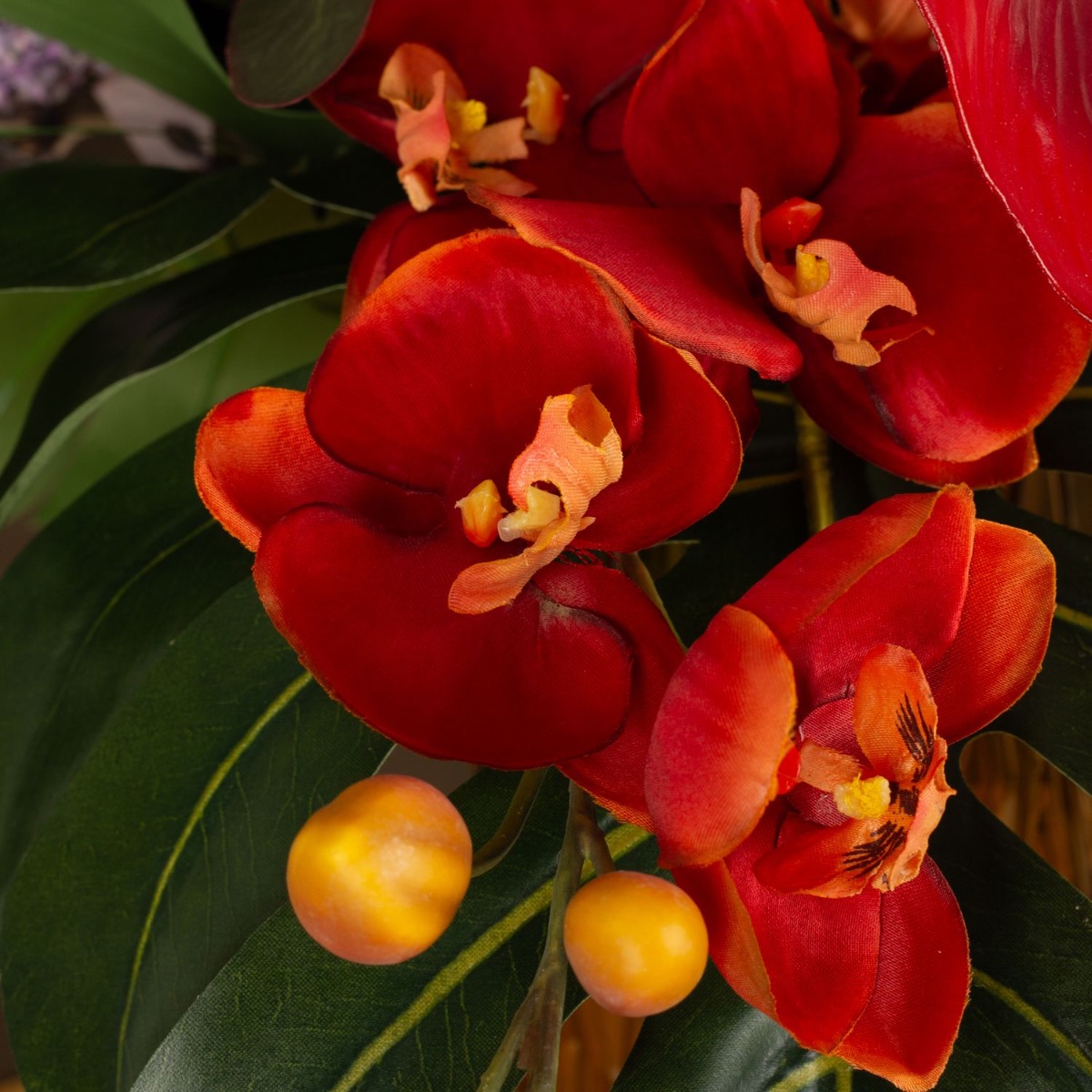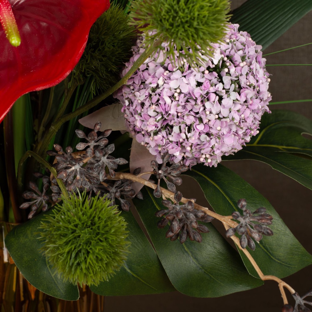 Strelitzia e Monstera! Una combinazione che rende esotico ogni bouquet. Anthurium, orchidee e kniphofia brillano in forti tonalità rosse e arancioni e danno vita al colore. Il vaso giallo-arancio crea con la sua struttura uno straordinario gioco di luce e fa risplendere il bouquet Acquista il look!