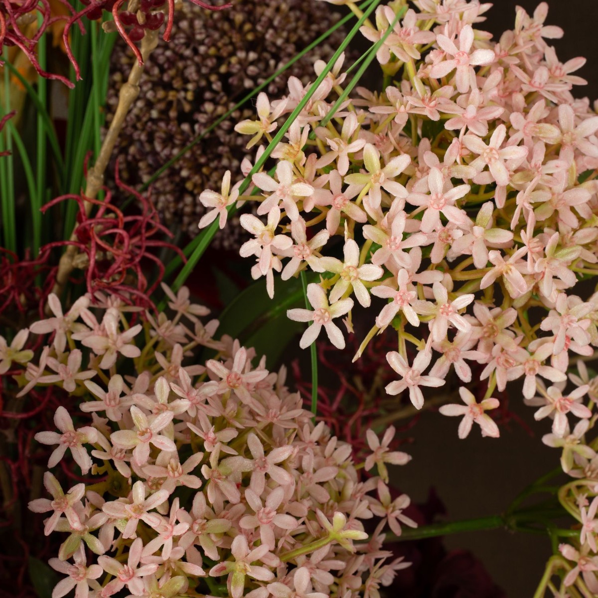 Suggerimento per il design: Con un bouquet inizi sempre dal centro. È meglio iniziare con la kniphofia e poi procedere verso l'uscita. Infine arrivano le foglie di Monstera che incorniciano il bouquet. Quindi, taglia gli steli all'altezza del vaso con una pinza laterale.