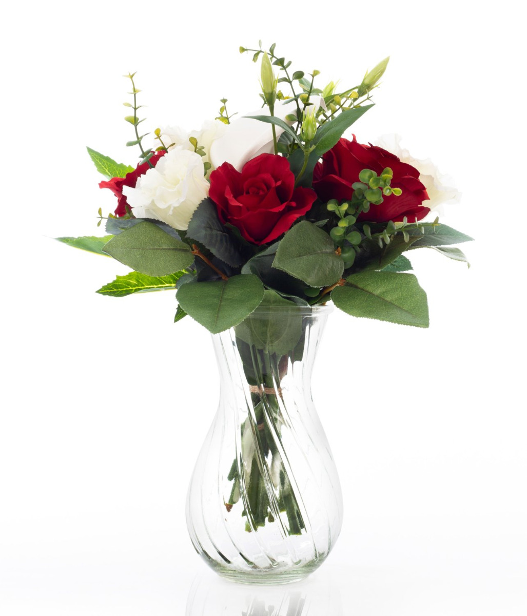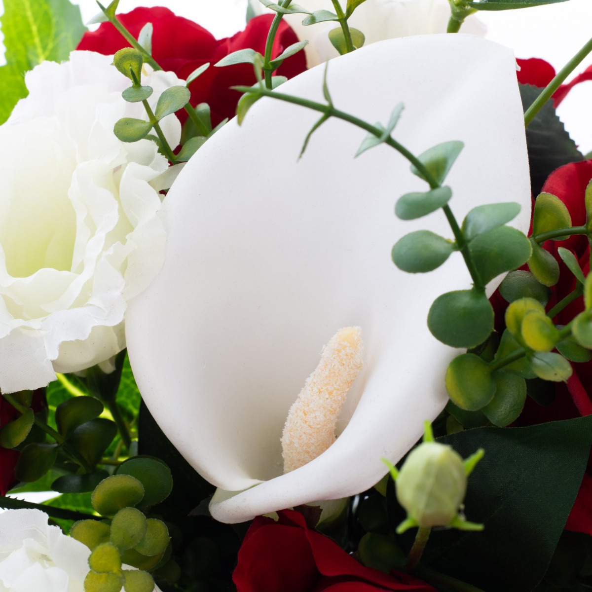 L'elegante bouquet di fiori artificiali ELAYNA lascia un ricordo indelebile in chi lo riceve ed è quindi perfetto per occasioni davvero speciali. Le rose rosse creano accenti sapienti e sono circondate dal lisianthus bianco, mentre un'attenzione particolare è riservata alla calla che troneggia al centro del bouquet. L'insieme floreale è completato dall'eucalipto, che alleggerisce il bouquet, e da una ghirlanda di foglie composta da rami di melo e una grande foglia di aralia.
