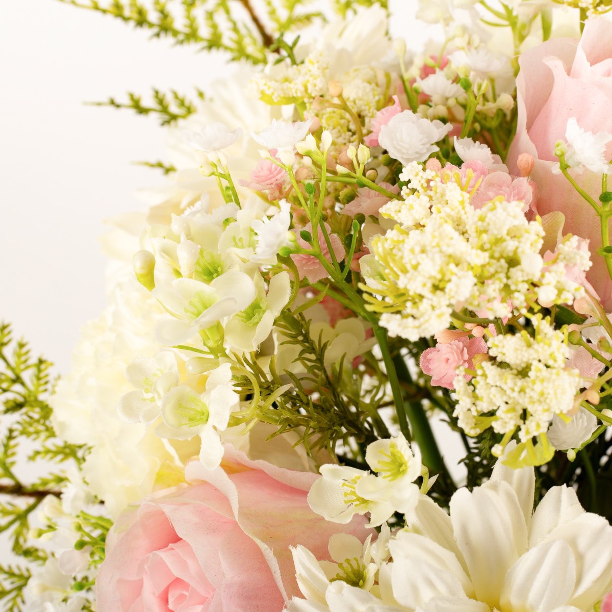Legato a mano in Germania, questo bouquet fintoMALIA è composto da una combinazione di fiori perfettamente coordinati. Il bouquet floreale è composto da fiori finti da achillea e velo di sposa avvolti da foglie di Asparagus plumosus . La composizione floreale è una perfetta compagna per la decorazione di eventi quali la festa della mamma, festa della donna, compleanni o semplicemente come grazioso regalo.