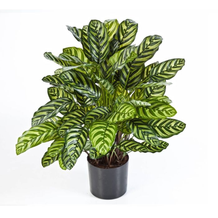 Pianta artificiale Calathea Zebrina BADU con 90 foglie verdi-gialle dall'aspetto naturale. La calathea è alta complessivamente 80 cm e viene consegnata completa di base cementata inserita in un vaso per facilitarne la sistemazione in un coprivaso a vostra scelta.