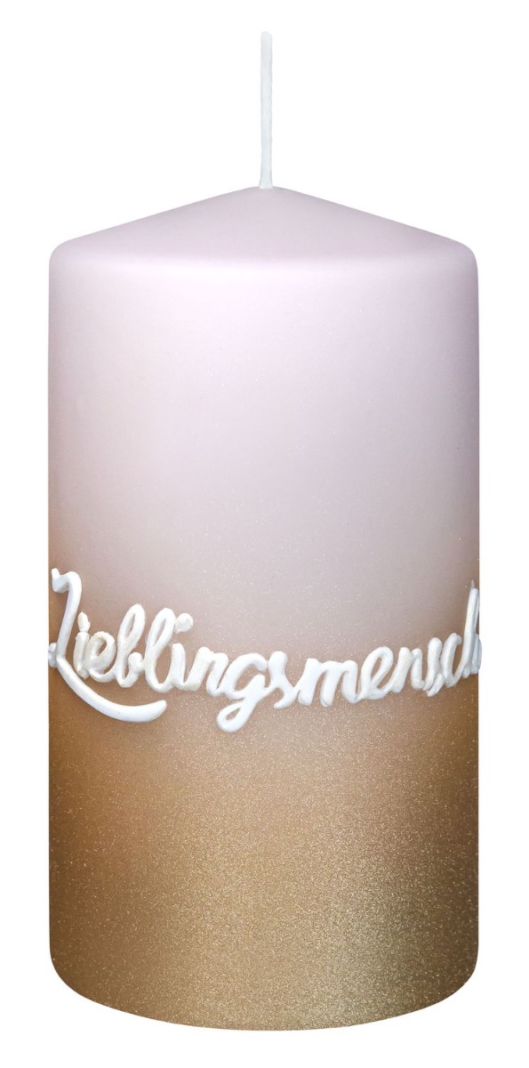 Candela corta JARDENA con scritta, persona cara, rosa delicato-oro, 13 cm, Ø 7 cm, 52 h
