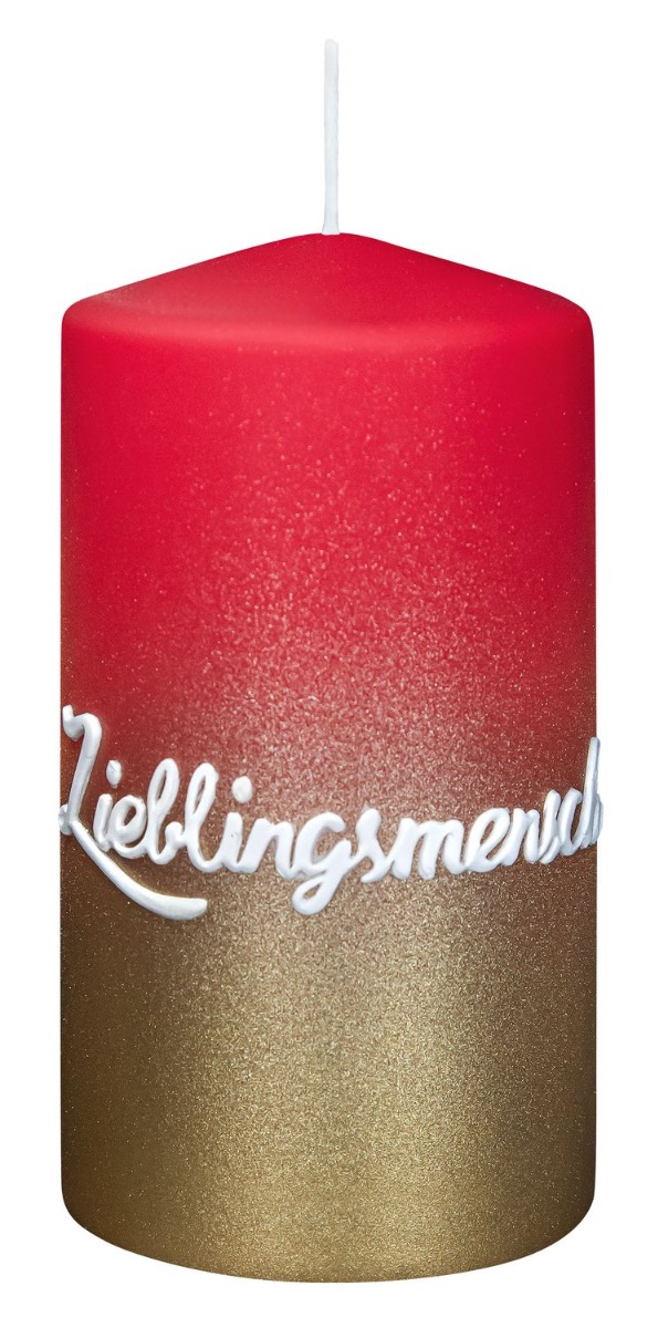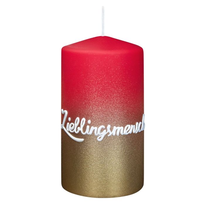 Candela tronca JARDENA con scritta, persona cara, rosso antico-oro, 13 cm, Ø 7 cm, 52 h