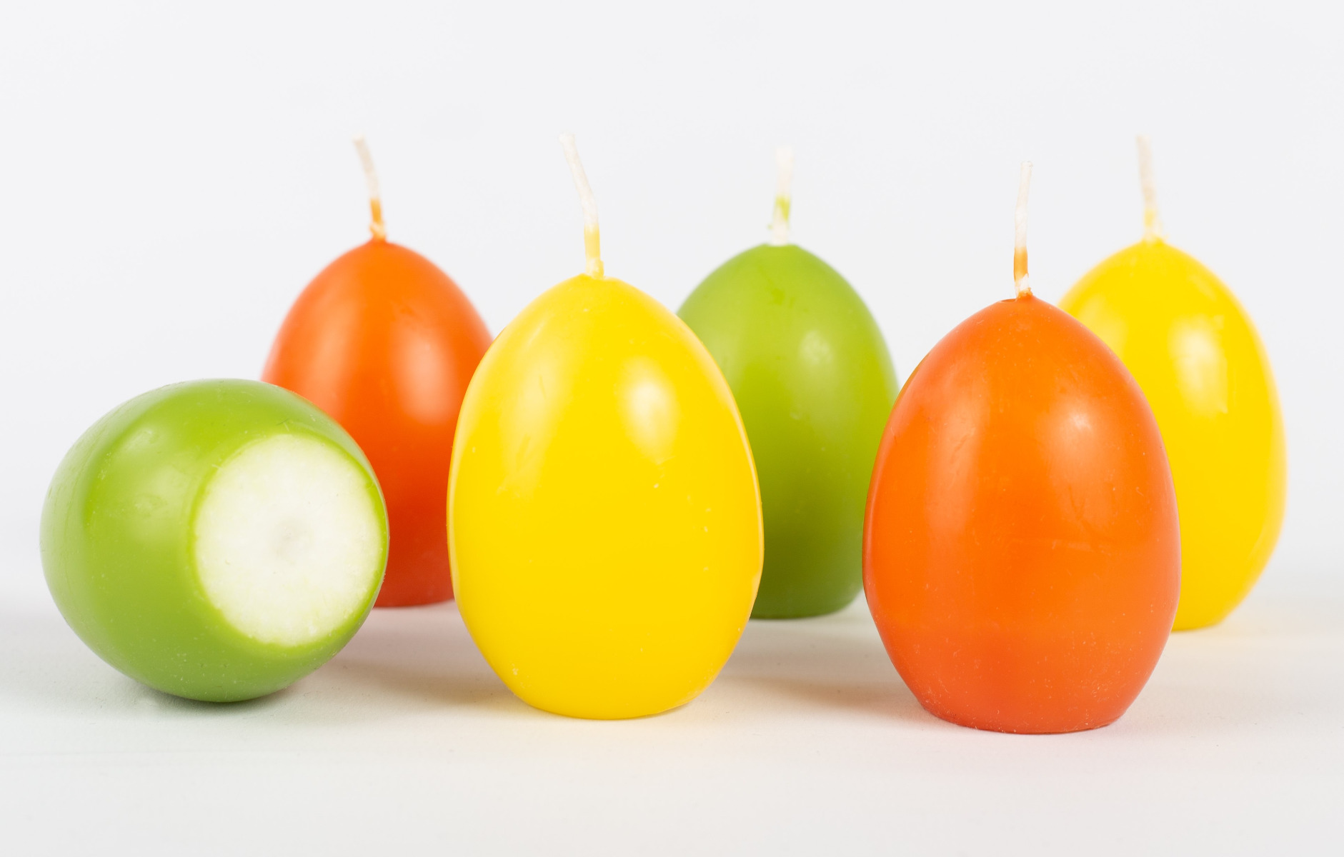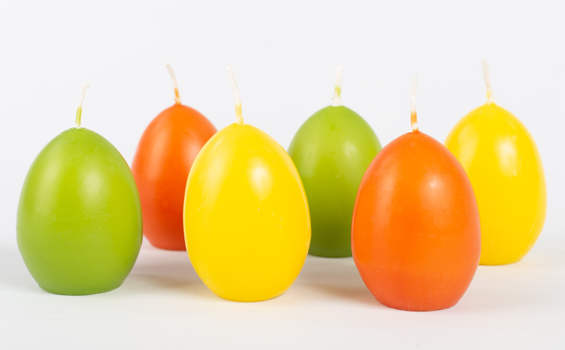Candele a forma di uovo di Pasqua LEONITA, 6 pezzi, giallo-arancione-verde, 6 cm, 4,5 cm, 7 h - Made in Germany