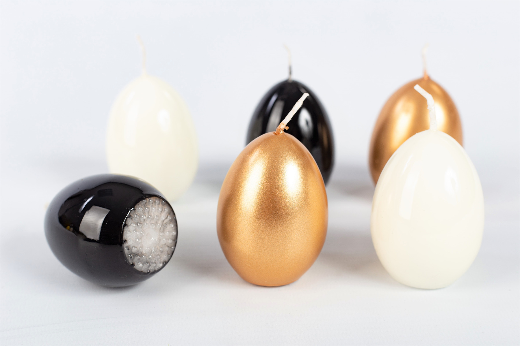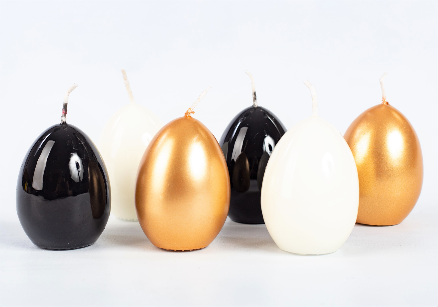 Candele a forma di uovo di Pasqua LEONITA, 6 pezzi, oro-nero-avorio, 6 cm, 4,5 cm, 7 h - Made in Germany