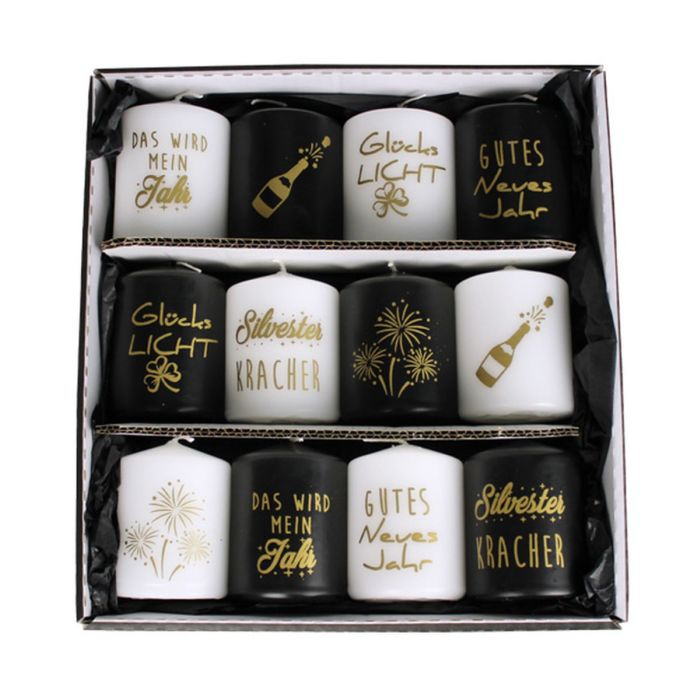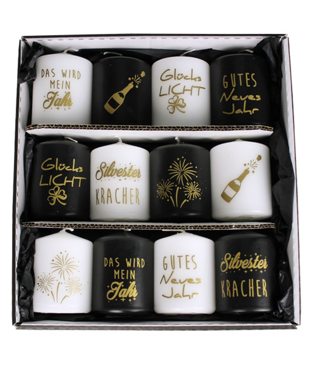 Candele a testa piatta OVILA per Capodanno, 12 pezzi, bianco-nero-oro, 8 cm, Ø6 cm - Made in Germany
