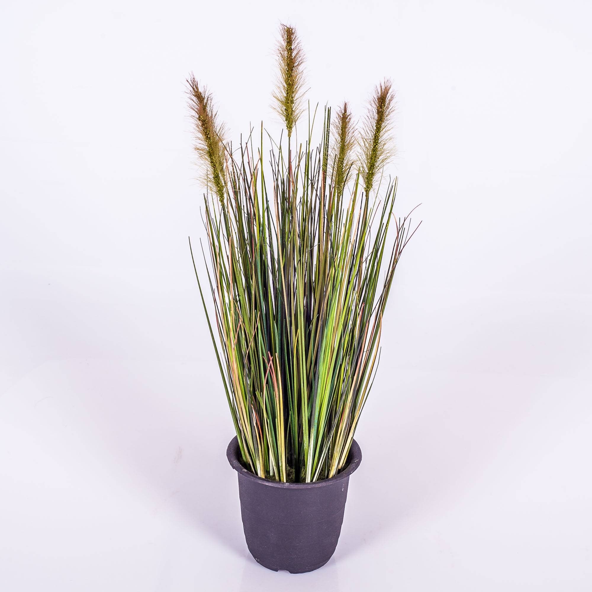 Coda di volpe (detta anche Foxtail grass) in vaso. Il cespuglio con fili d´erba verdi e tocchi di giallo ha un´altezza complessiva di ca. 45 cm.