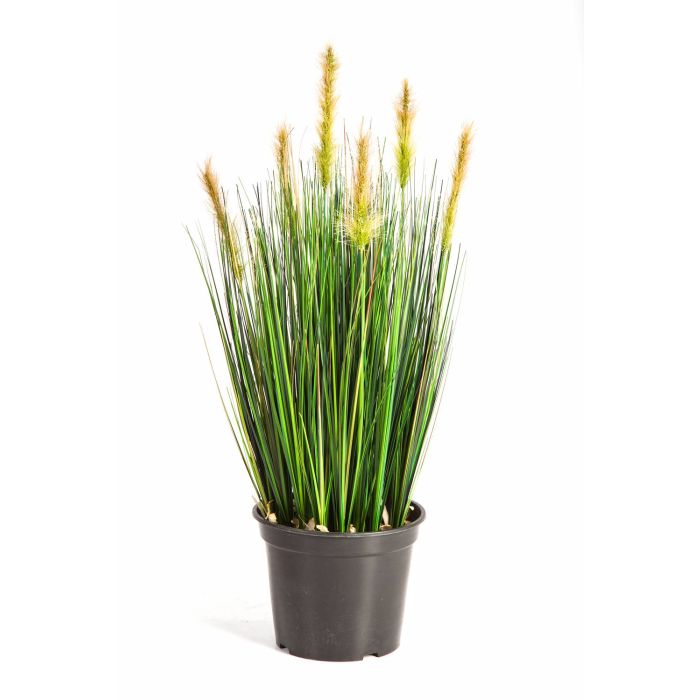 Cespuglio artificiale con 790 fili d'erba completo di vaso in plastica nero. Quest'erba coda di volpe ha un'altezza complessiva di 60 cm e 6 spighe gialle.