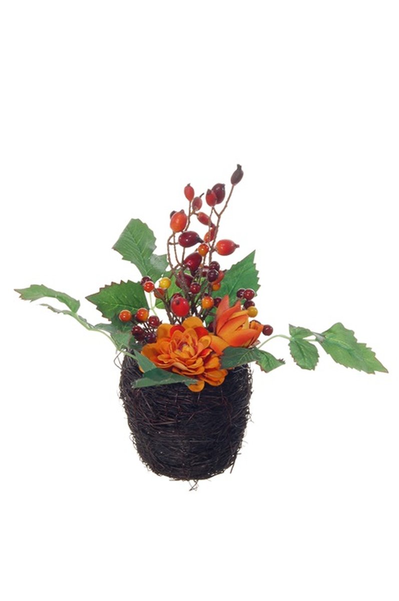 Composizione floreale artificiale di dalia, rosa canina ABED in cesto, rosso-arancio, 17cm, Ø10cm