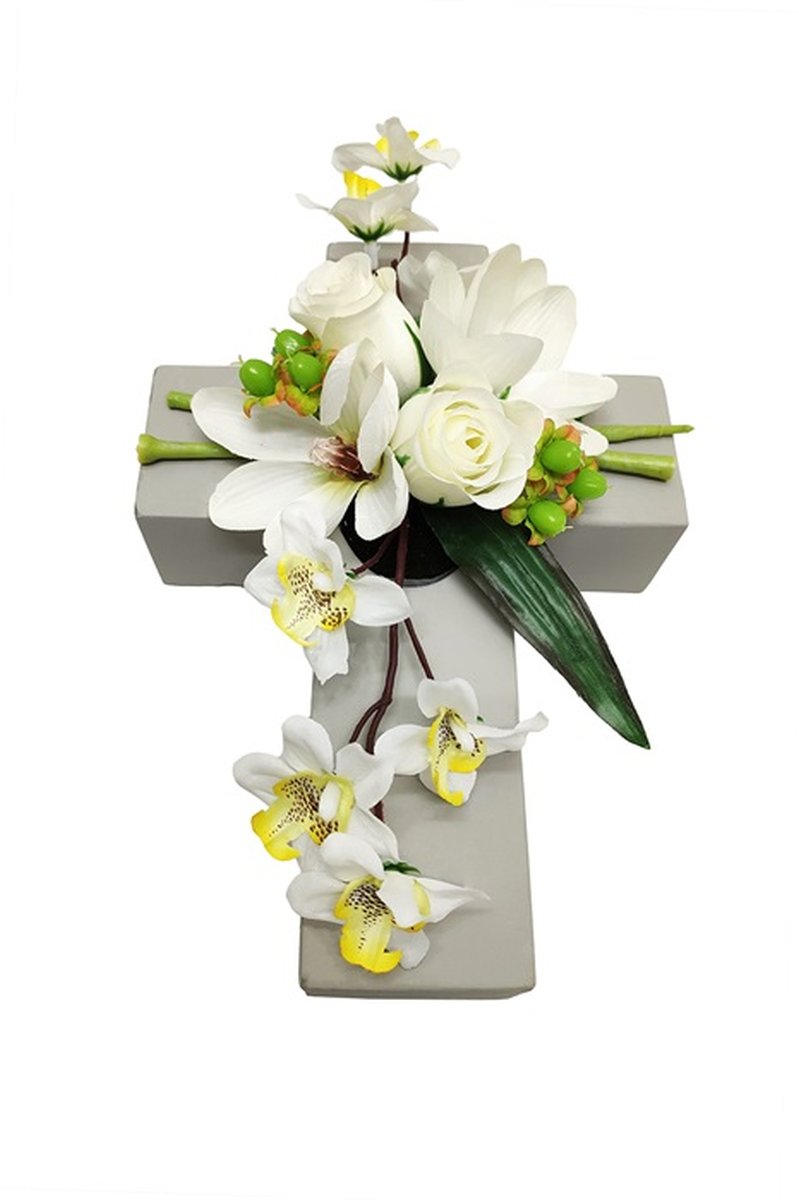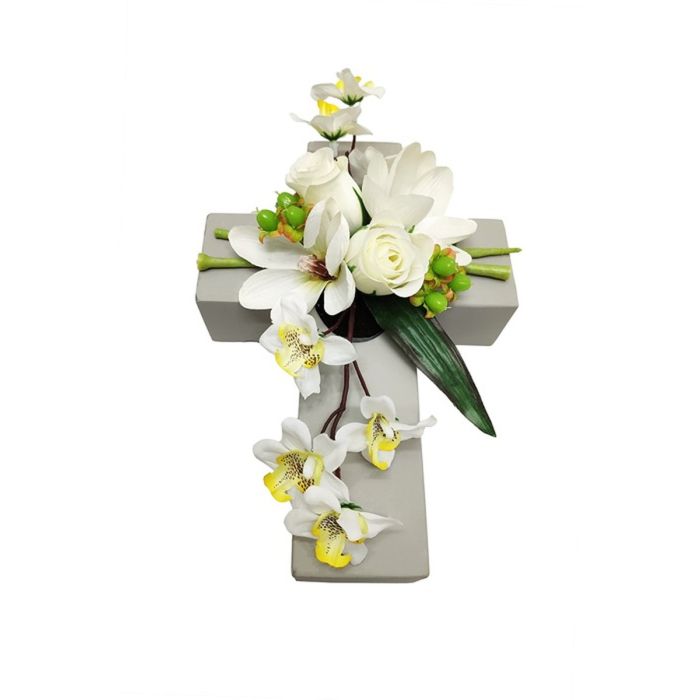 Composizione floreale artificiale di magnolia, orchidea, rosa OVANA, croce, bianco, 28x18x10cm