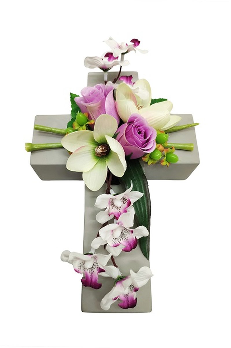 Composizione floreale artificiale di magnolia, orchidea, rosa OVANA, croce, bianco-viola-crema, 28x18x10cm