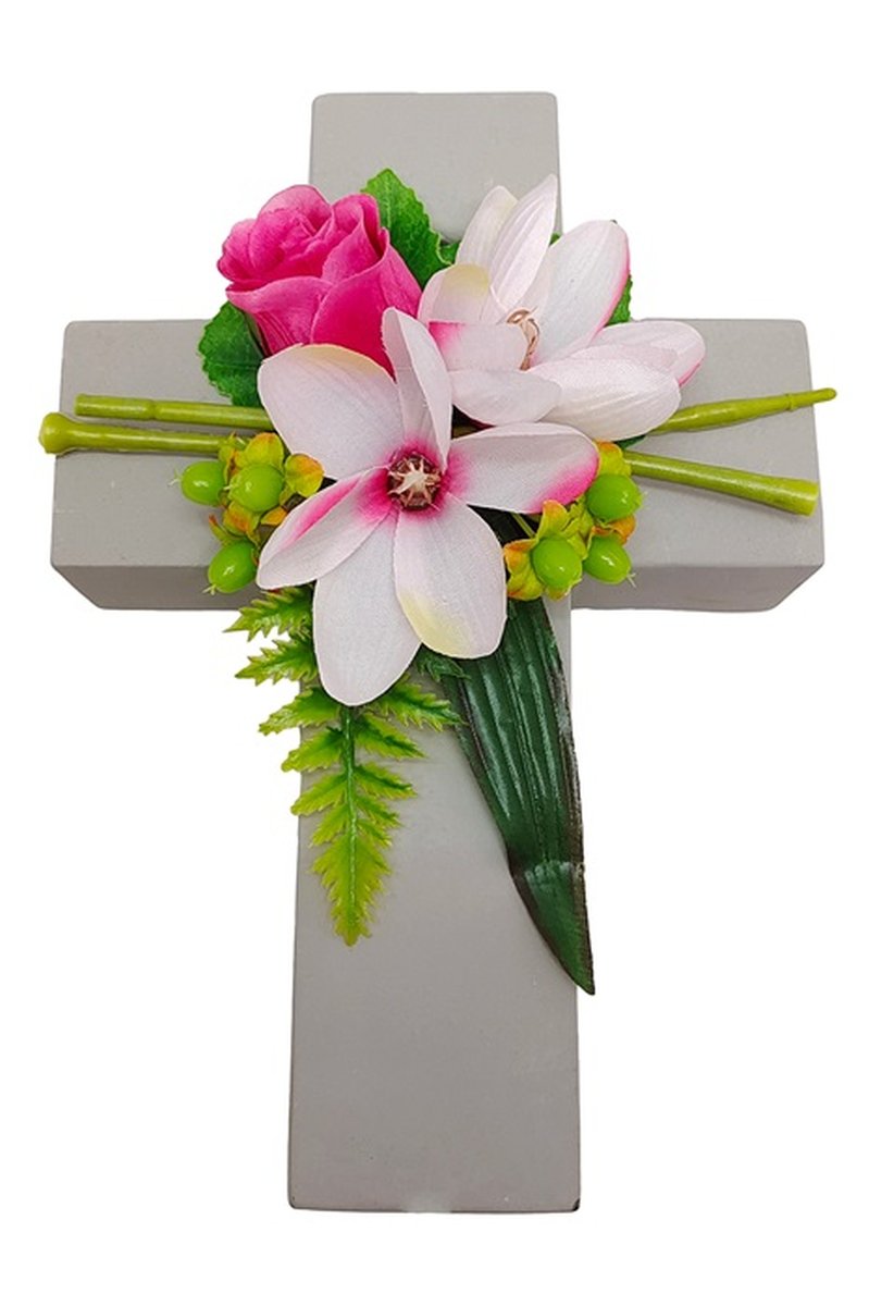 - La composizione floreale su una croce è un bellissimo arricchimento, ad esempio per la decorazione di una tomba, si prega di notare che non possiamo dare alcuna garanzia per la longevità e la durata per l'uso all'aperto, i fiori artificiali possono scolorire a causa dei raggi UV, diventare fragili o strapparsi a causa del vento!