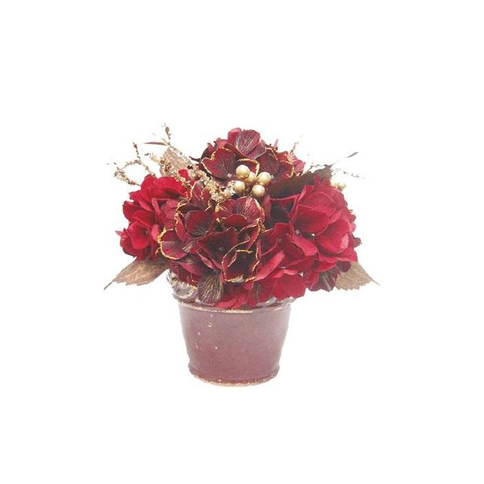 Composizione floreale artificiale di ortensia, bacche SUKI, vaso decorativo, rosso-oro, Ø25cm