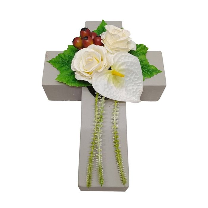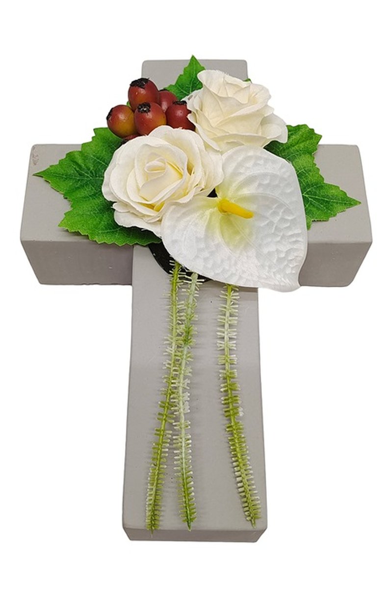 Composizione floreale artificiale di rosa, anthurium, rosa canina NINNA, croce, bianco-rosso, 30x18x11cm