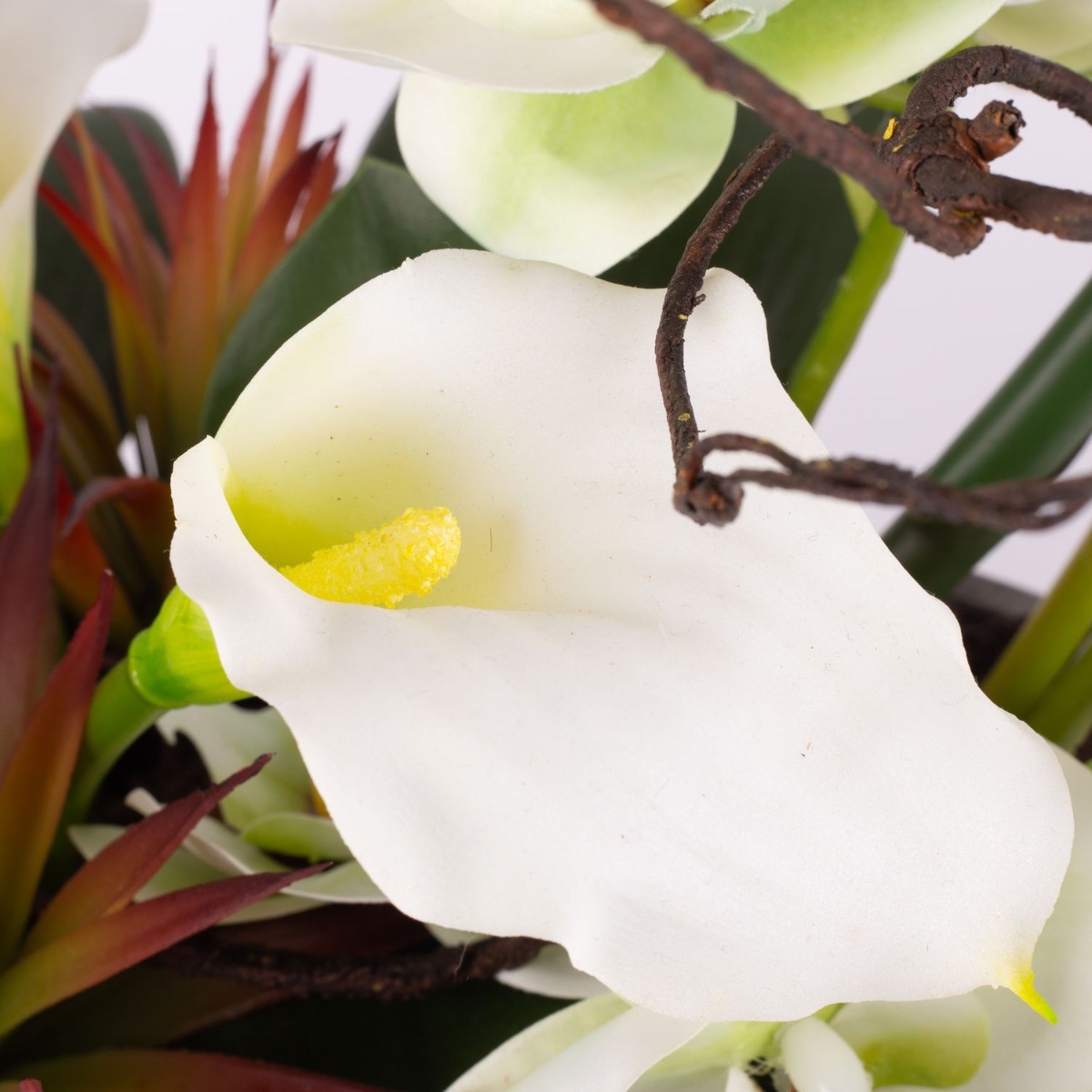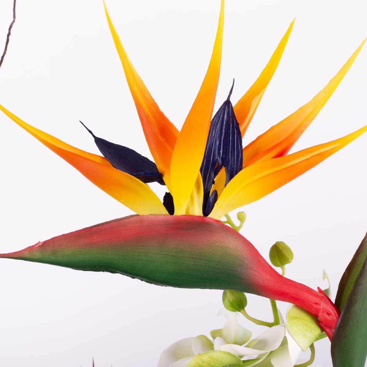 Composizione floreale artificiale esotica LOVARA, strelitzia, orchidea, calla, arancione-bianco-verde, 55x30x60 cm