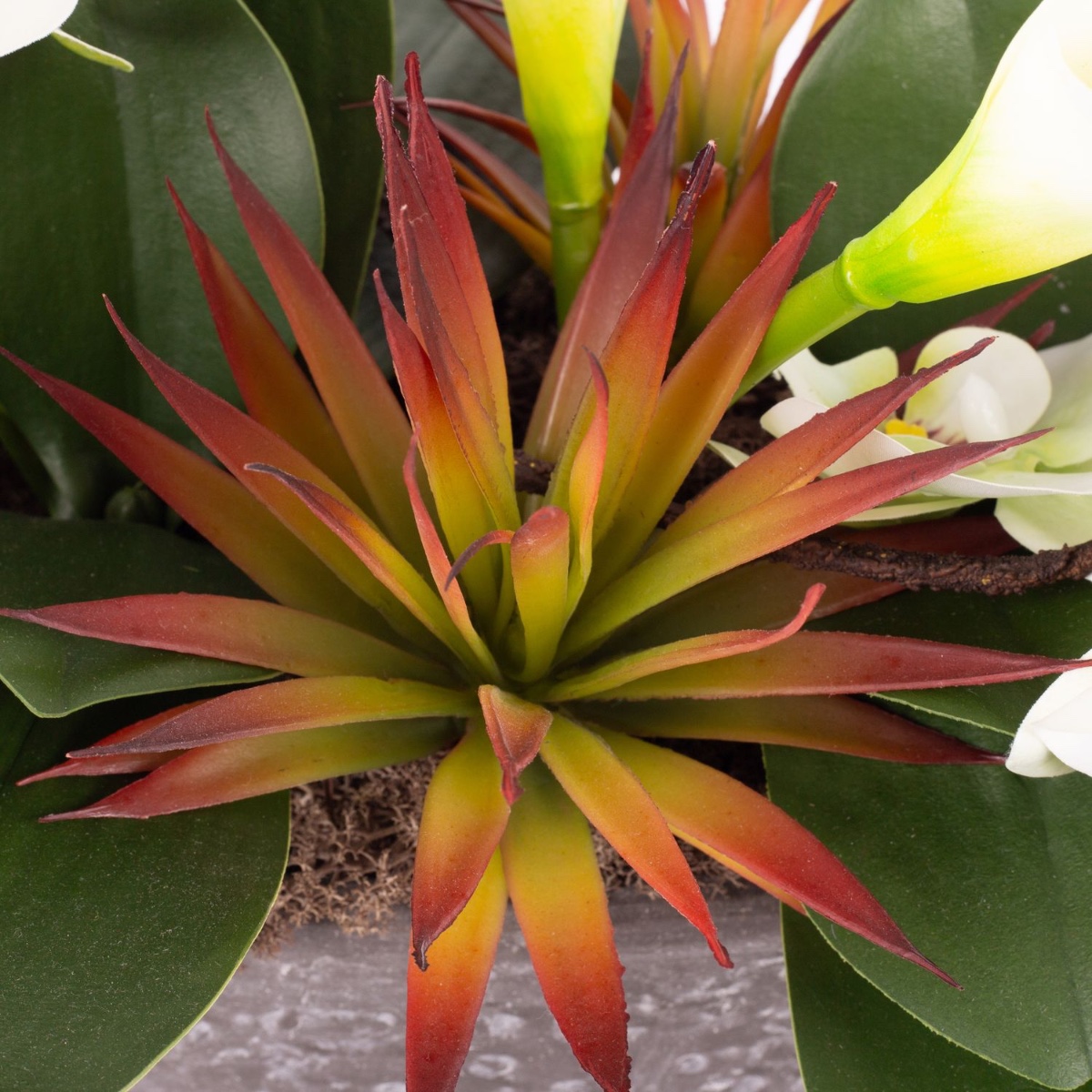 Un'affascinante composizione di fiori artificiali che unisce eleganza esotica e naturalezza moderna. I fiori luminosi a forma di uccellino delle strelizie danno un tocco dinamico, mentre le delicate orchidee aggiungono una nota di romantica leggerezza. I fiori ricurvi delle calle conferiscono alla composizione un tocco di classe, mentre le foglie caratteristiche dell'agave aggiungono struttura e un tocco di atmosfera desertica al design. Questa composizione è perfetta come elemento decorativo straordinario per occasioni speciali o come tocco artistico in ambienti moderni.