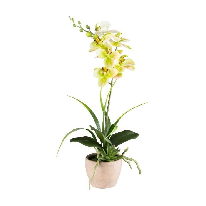 Composizione floreale artificiale orchidea Aeonium FININ, erba, vaso in cemento, radici, verde-bianco, 45 cm
