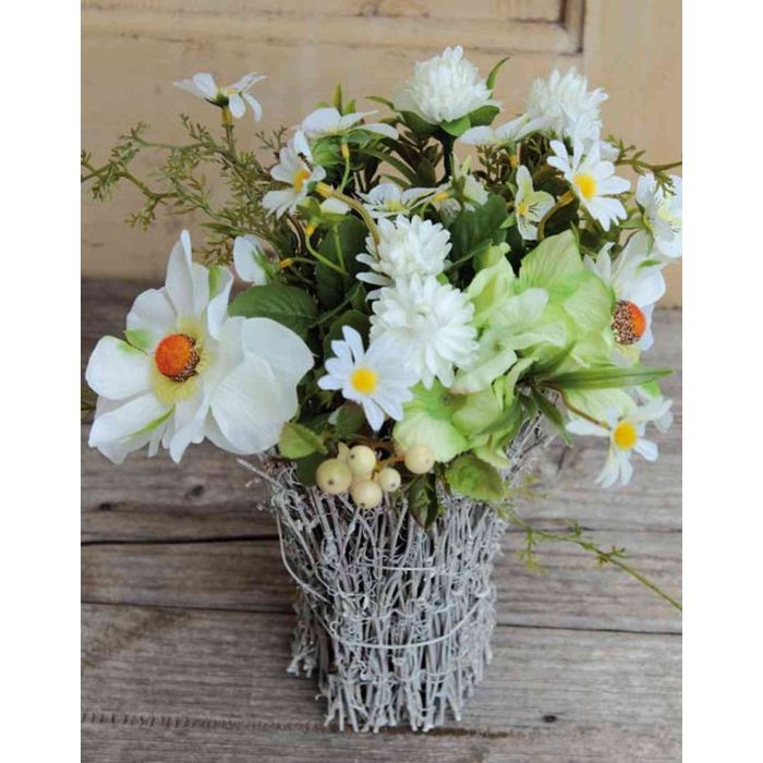 - La composizione è composta da viole del pensiero, anemoni, ortensie, margherite e fiordalisi in bianco e realizzati con materiali di alta qualità