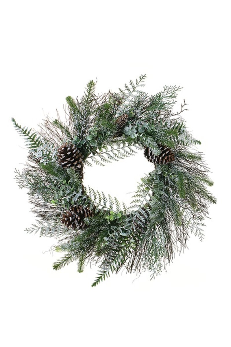 Corona artificiale di pino, eucalipto, felce TRISS con pigne, ghiacciato, verde-bianco, Ø60cm