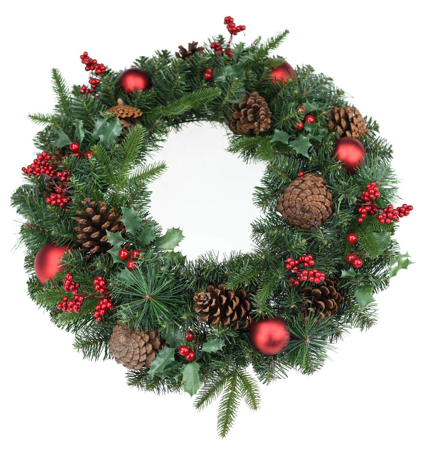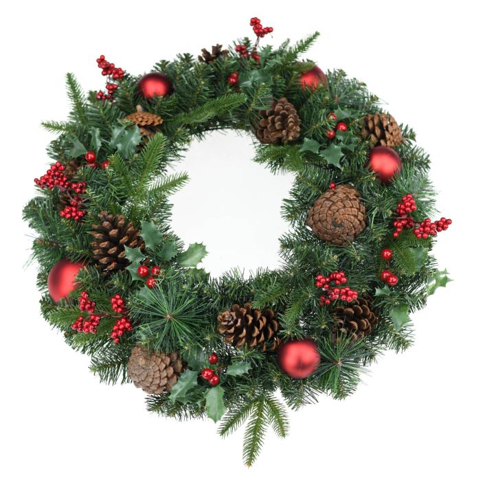 - Corona decorata con bacche rosse, agrifoglio, pigne e baubles rossi