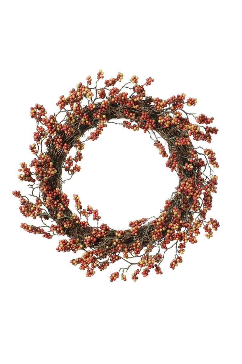 - Le numerose bacche rosso-arancio sono fissate a una corona di rattan