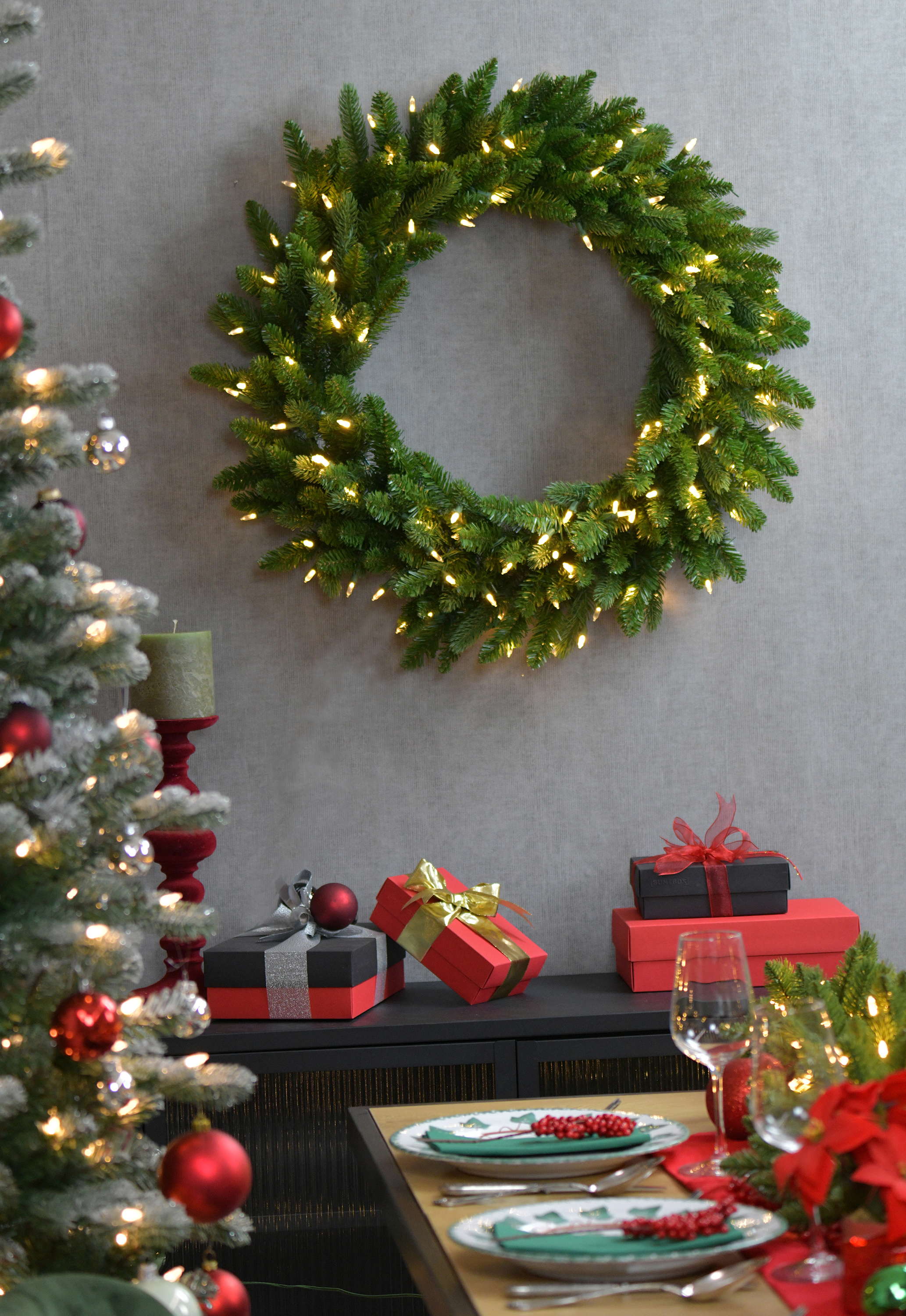 La corona invernale di plastica AMARILLO con aghi in PVC è perfetta per la decorazione natalizia della vostra casa.