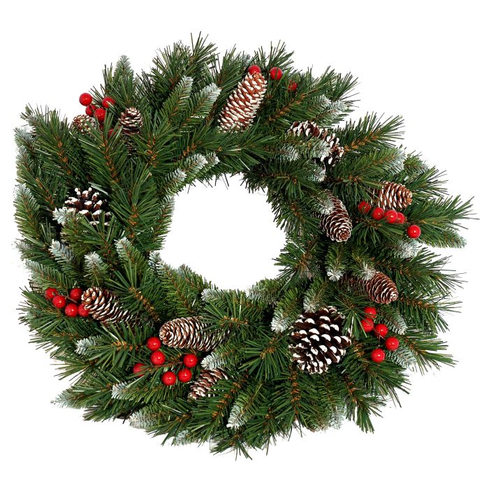 - Corona decorativa innevata con pigne e bacche rosse
