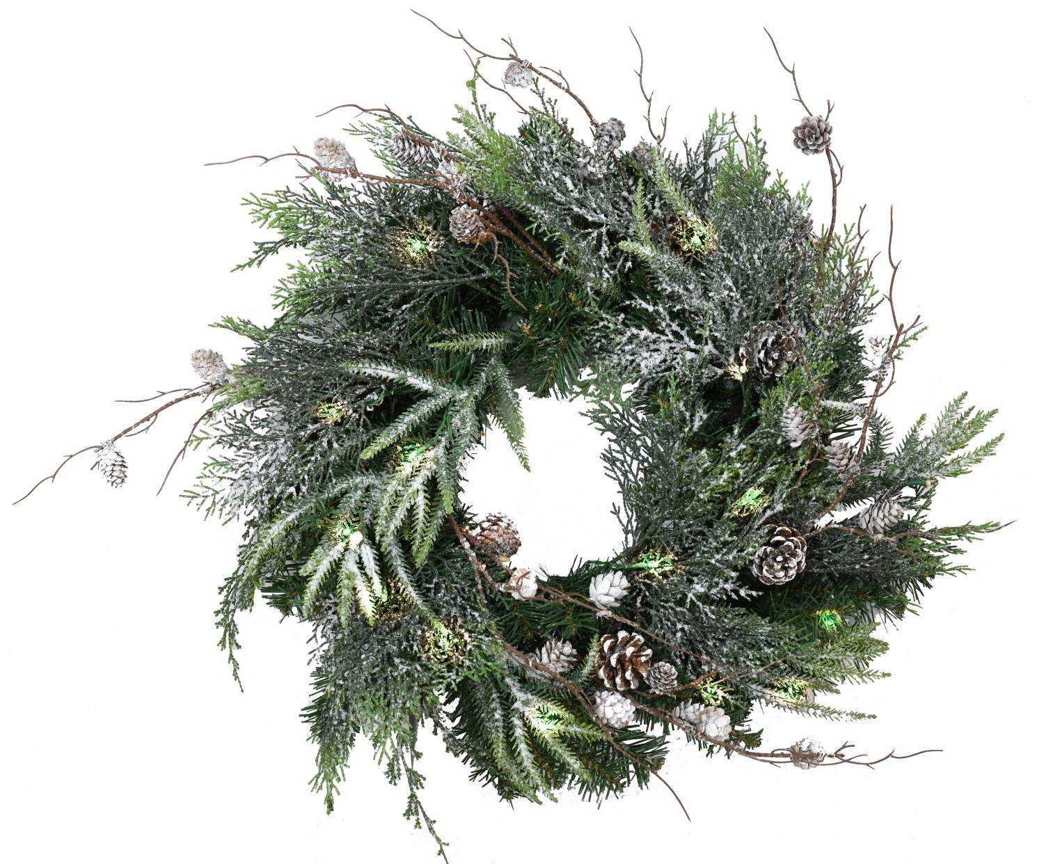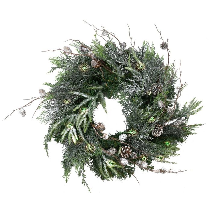 - Corona decorativa innevata con pigne e rami marroni e molti LED