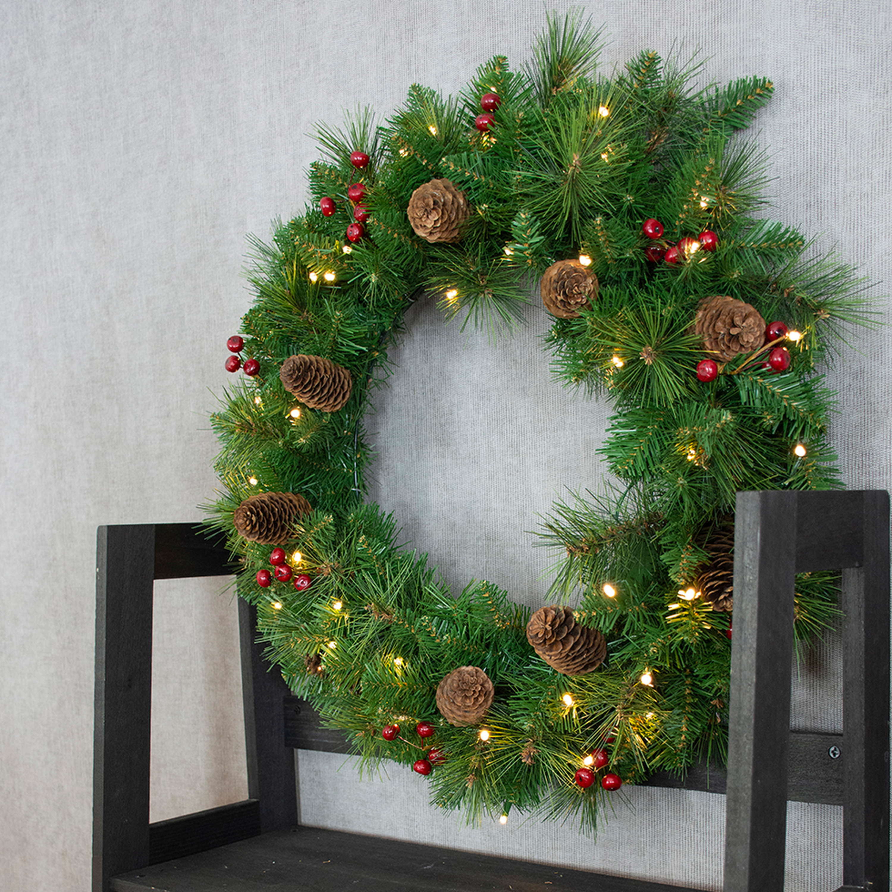 La corona finta BUKAREST è decorata con ribes rosso, pigne di abete e 50 luci. I rami d'aghi artificiali in verde sono pieghevoli e possono essere piegati singolarmente in forma.